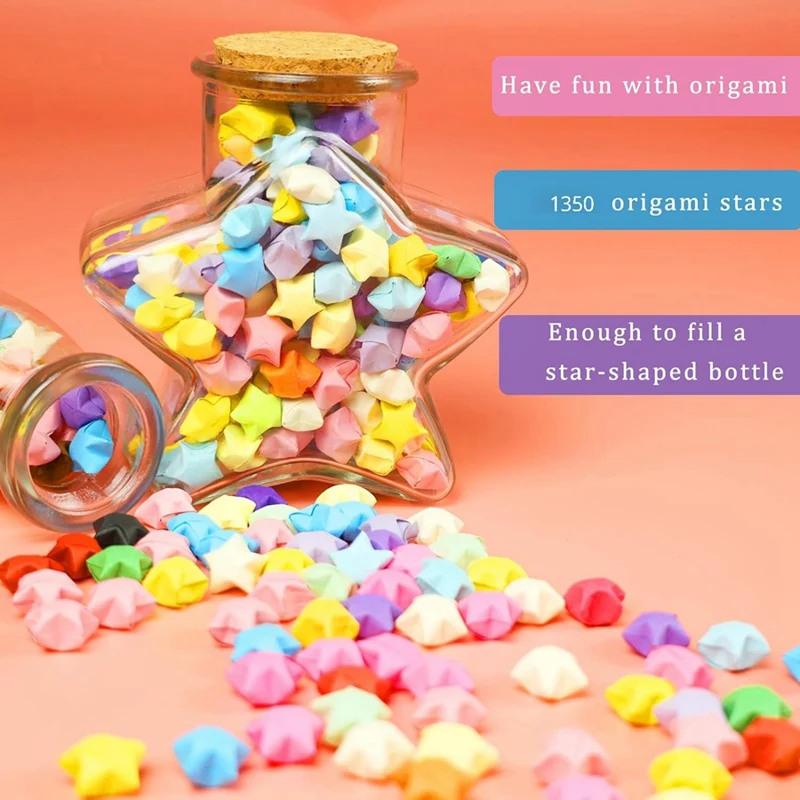 Amplia cantidad y colores intensos: hay 1350 hojas de tiras de papel de origami estrella en 27 colores y 56 tiras de cada color, suficientes para rellenar diferentes frascos de varias formas.Será bueno escribir notas en la tira de estrellas de papel a tus amigos.Además, puedes doblar un ramo de estrellas para tu familia y amigos, lo que también es un gran regalo para todos los amantes de las manualidades hechas a mano.