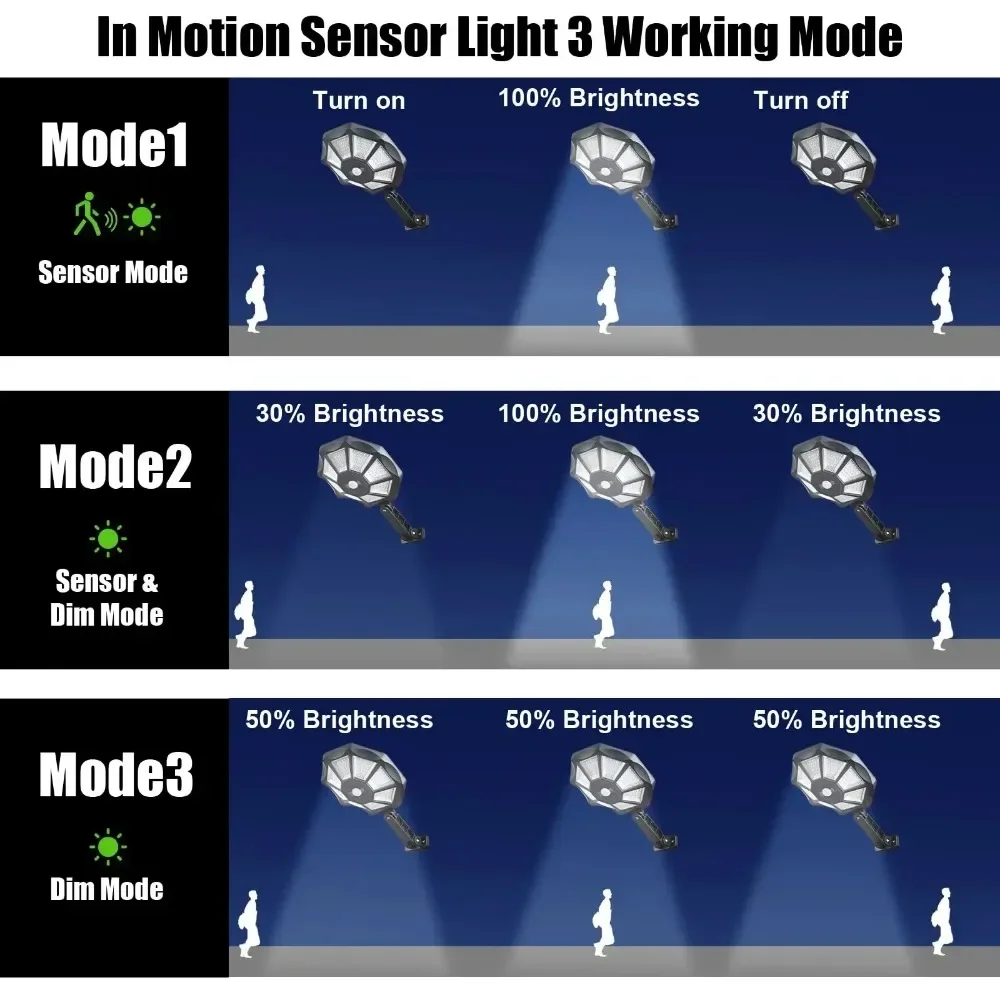 Intelligent Radar Sensor Chip: The solar parking lot lights provides 3 lighting modes: Mode 1: 100% light brightness when motion is detected, and automatically turns off when there is no motion at night. Mode 2: When motion is detected, the light is at 100% brightness. After 20 seconds of no motion at night, it goes to 20% brightness. Mode 3: Lights automatically turn on at night at 50% brightness.