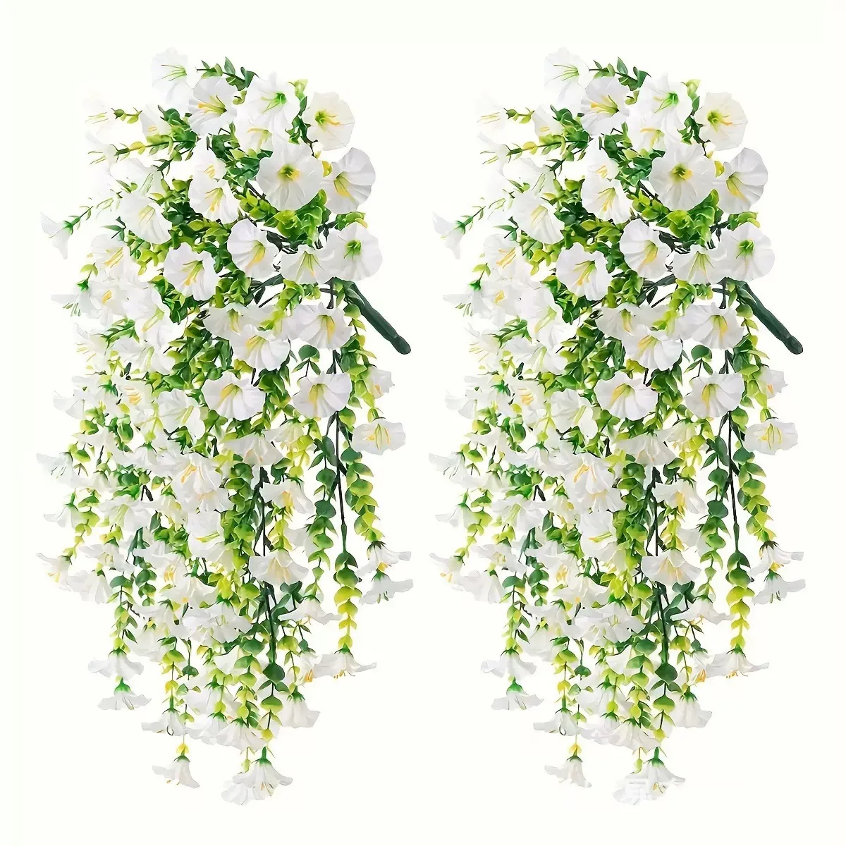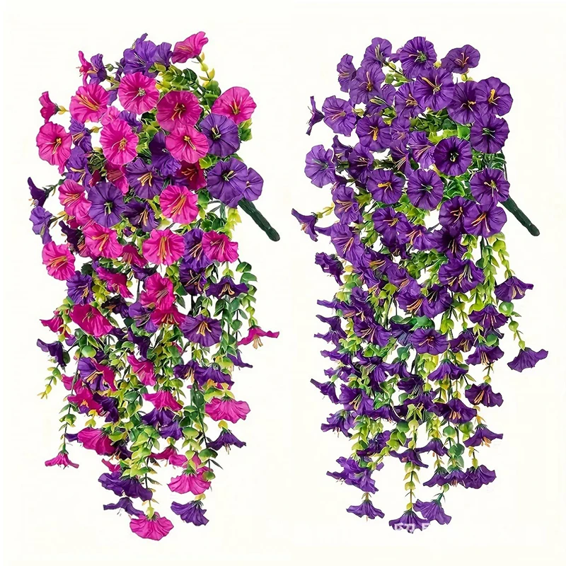 2 uds flores artificiales falsas flores de gloria de la mañana hojas de eucalipto flores colgantes para fiesta al aire libre decoración de jardín de boda