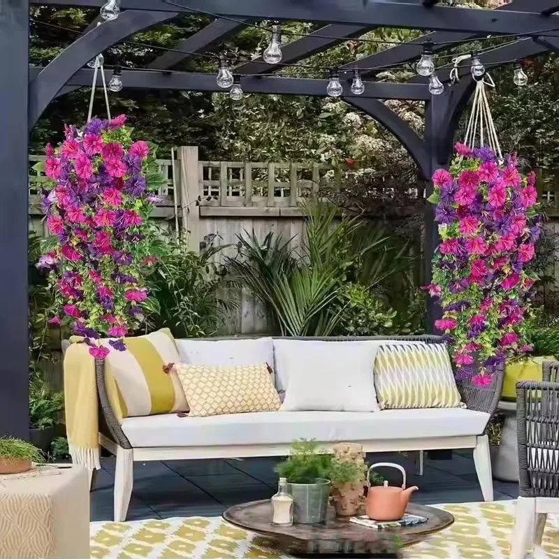 2 uds flores artificiales falsas flores de gloria de la mañana hojas de eucalipto flores colgantes para fiesta al aire libre decoración de jardín de boda