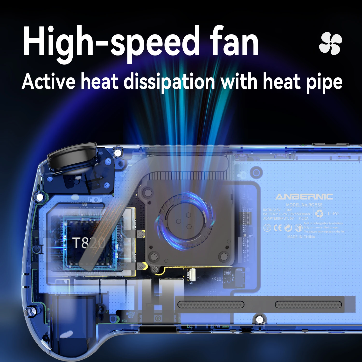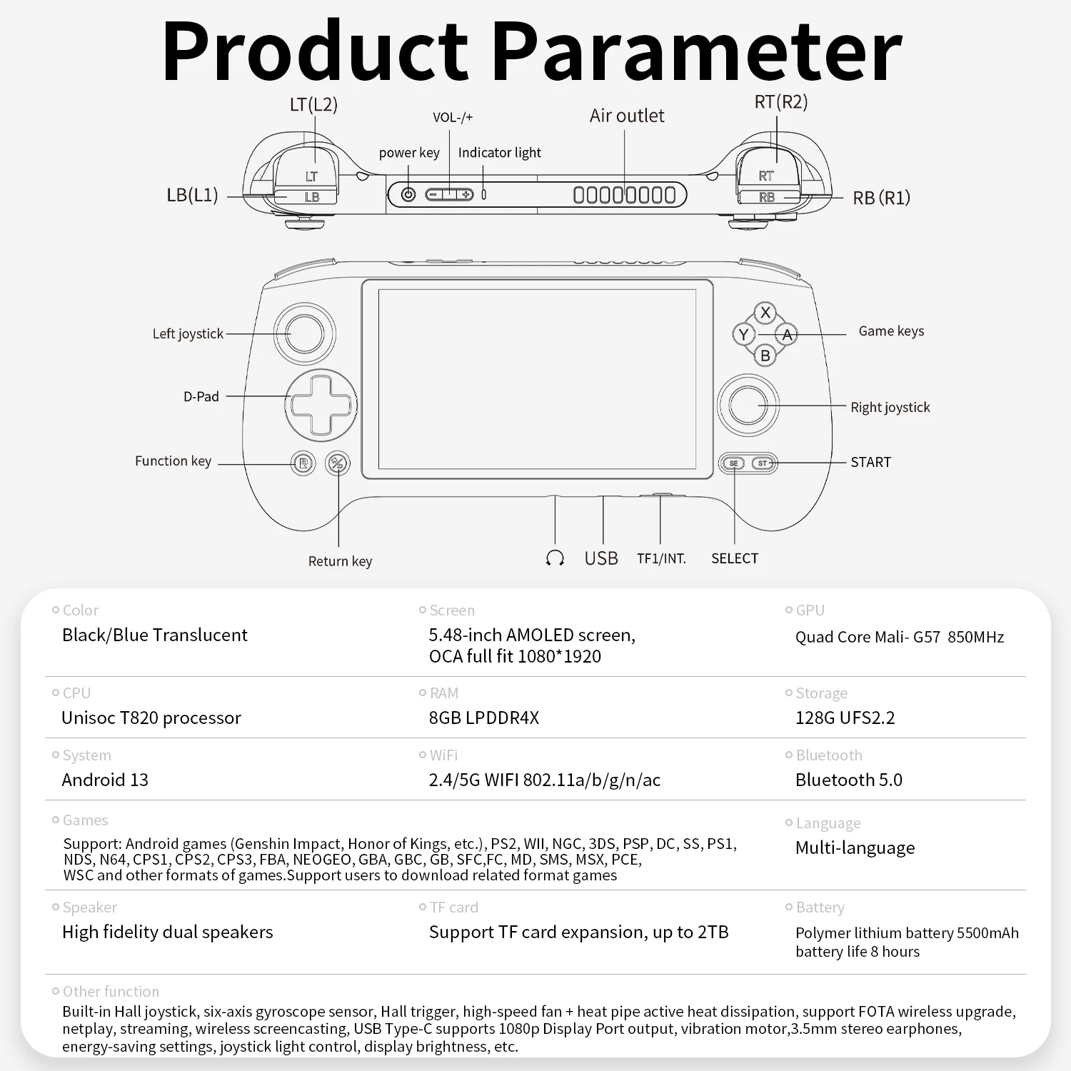 Joystick Hall incorporado, sensor de giroscopio de seis ejes, Hall gatillo, ventilador de alta velocidad + disipación de calor activa del tubo de calor, Compatible con actualización inalámbrica FOTA, netplay, streaming, screencasting inalámbrico, USB tipo C admite salida de puerto de visualización de 1080p, Motor de vibración, |