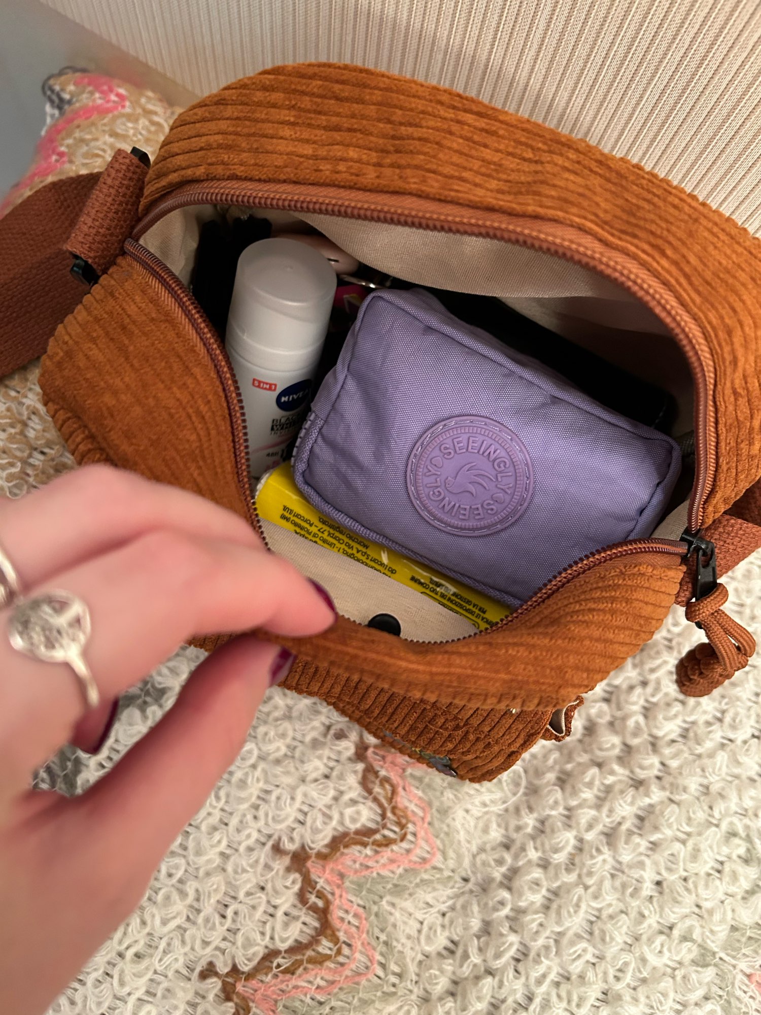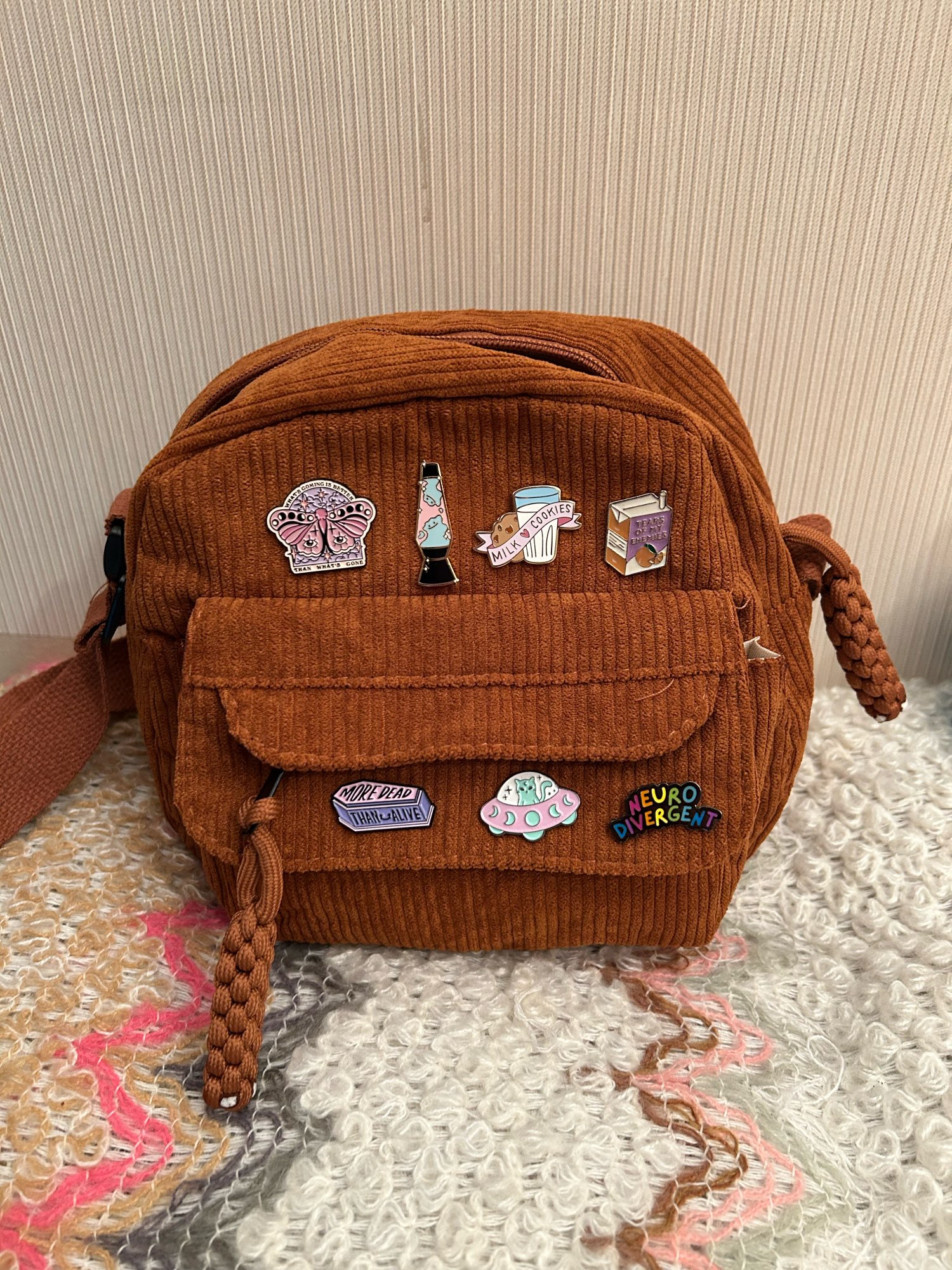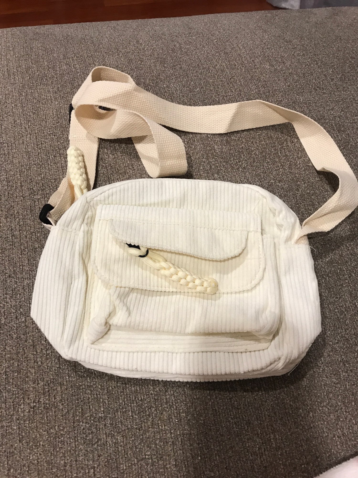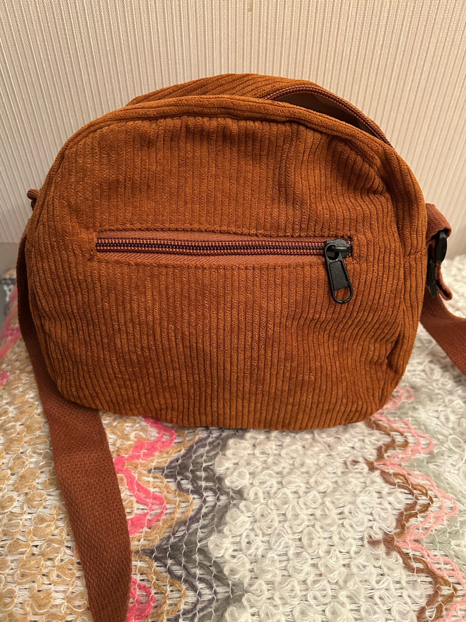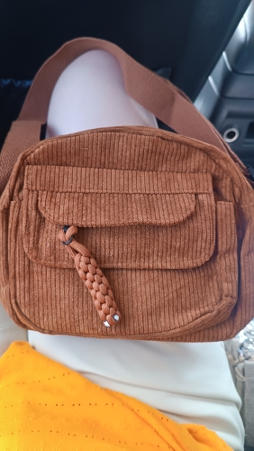 ¡Esta bolsa es perfecta! ¡La calidad es genial y me sorprendió con la cantidad de bolsillos que hay y la cantidad de espacio que tiene! En la parte delantera hay una pequeña bolsa con cremallera que es perfecta para fácil de evaluar chapstick justo en frente de una gran solapa. Entonces el compartimento principal, por supuesto, tiene mucho una habitación, entonces también tiene un bolsillo trasero con cremallera. Esta es una bolsa muy funcional que es linda e incluso muy cómoda ya que las correas son más anchas. ¡Realmente me encanta y recomiendo comprar!