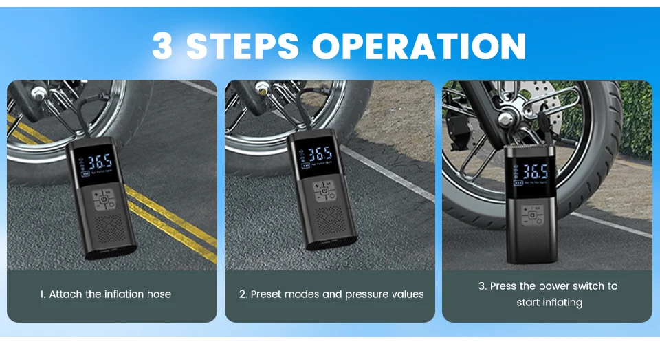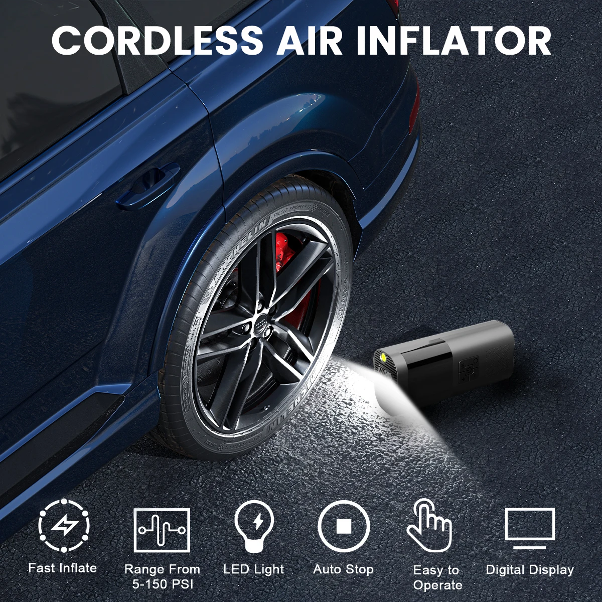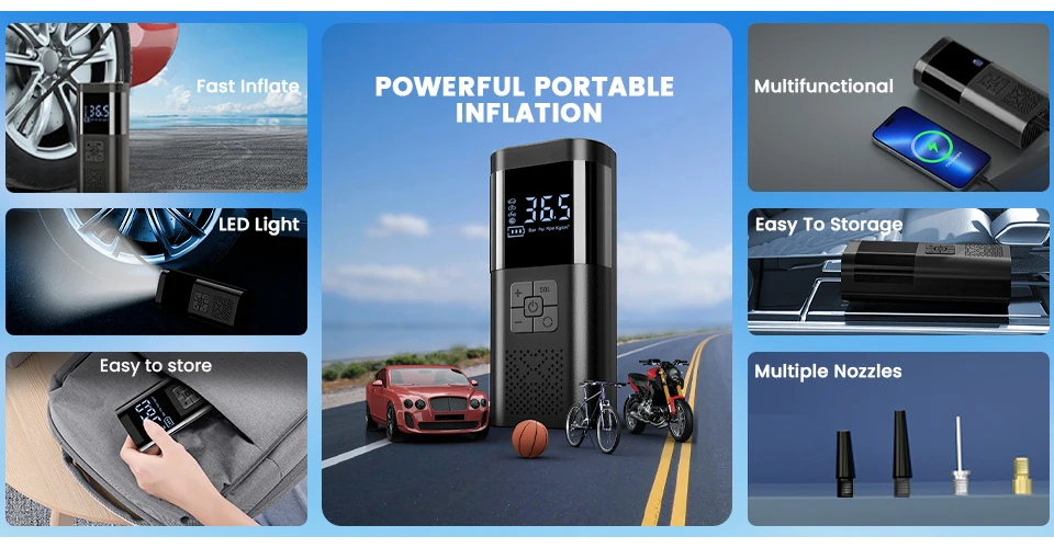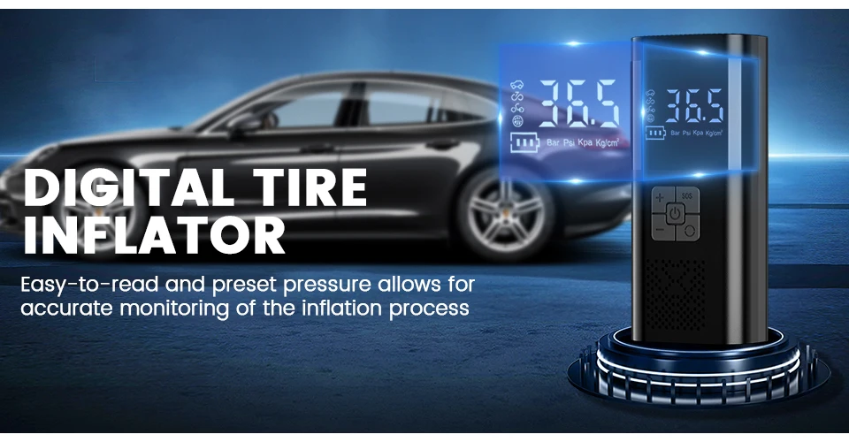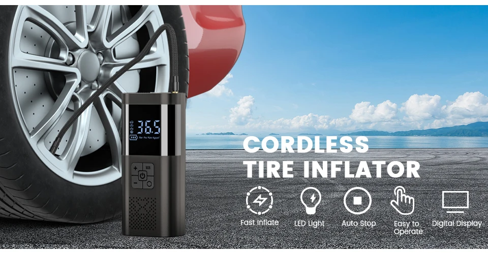 Cuenta con una gran pantalla inteligente y función de detección de presión de neumáticos, con una presión máxima de 150 PSI, lo que proporciona una operación conveniente para inflar varios neumáticos, kayaks y pelotas.