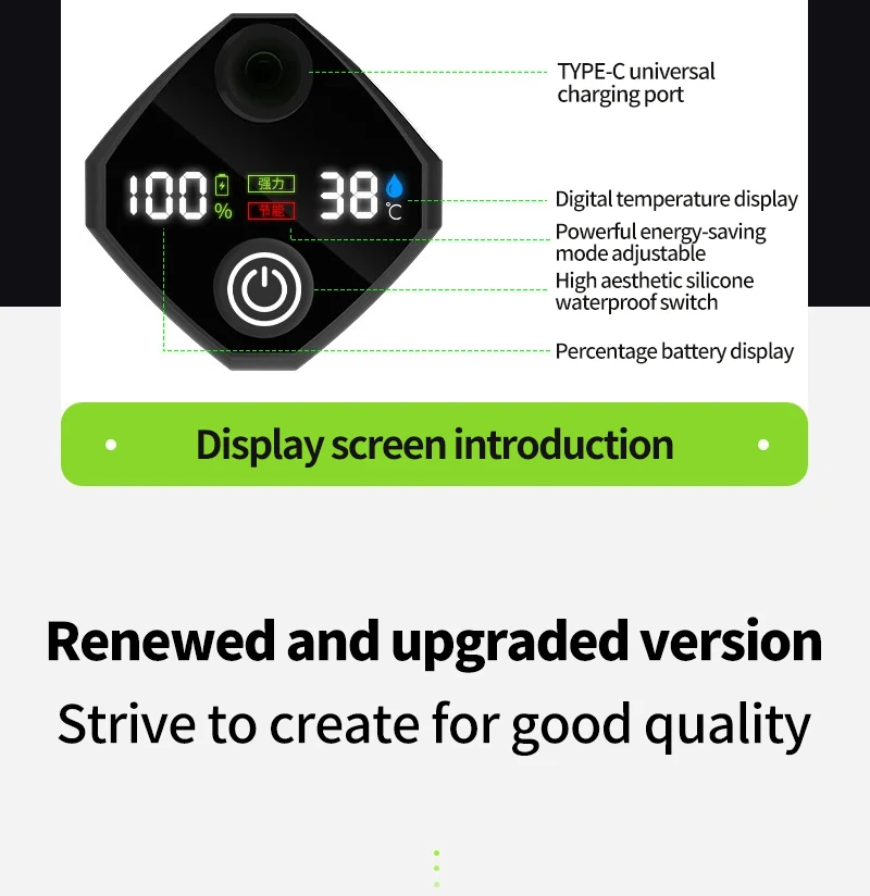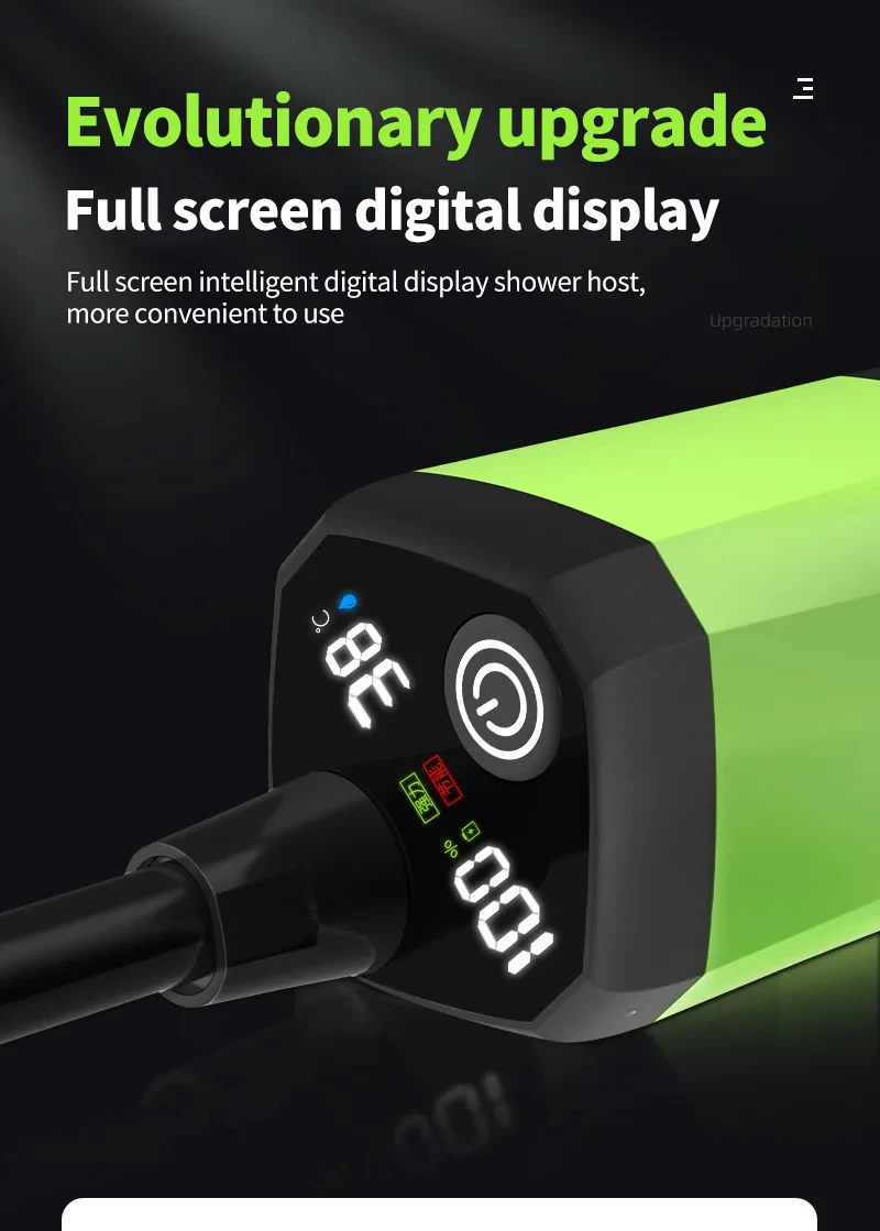 Esta bomba de ducha portátil para acampar es perfecta para todas tus aventuras al aire libre.Con una pantalla digital inteligente de pantalla completa, puede controlar fácilmente la temperatura y el nivel de la batería.El modo de ahorro de energía de alta eficiencia es ajustable para satisfacer sus necesidades.La bomba de ducha funciona con una batería de 6000 mAh que se carga en solo 1 o 2 horas.Es el complemento perfecto para su kit de ducha exterior para vehículos recreativos.