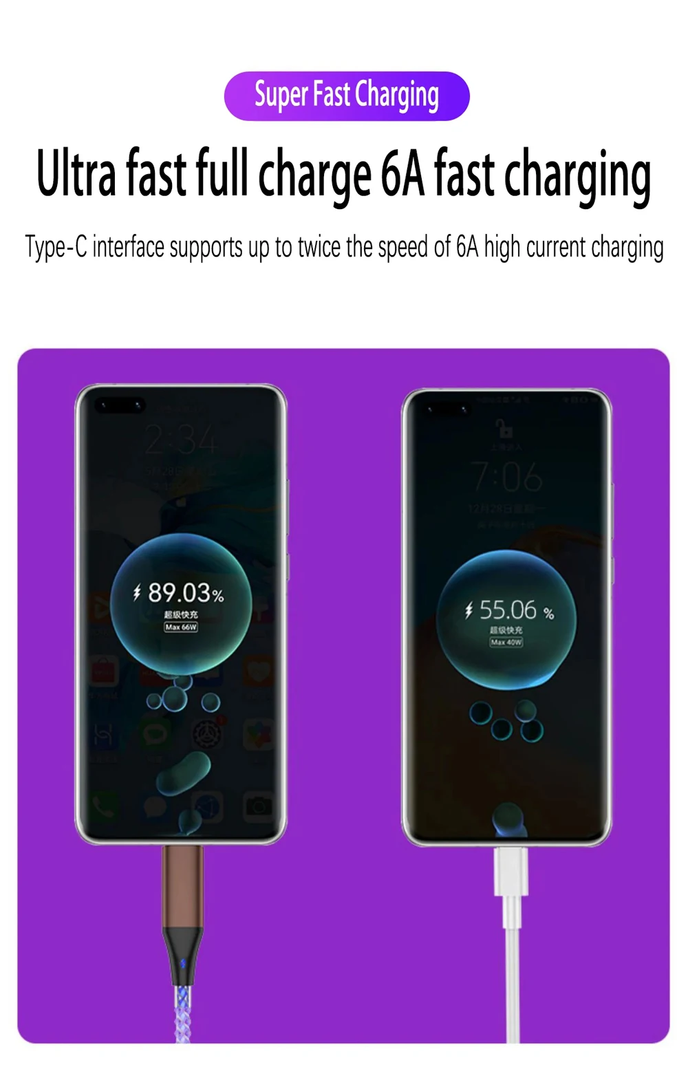 Cable de carga rápida 3 en 1 66W 6A luz RGB USB tipo C Micro Cable de datos para iPhone 14 Pro Max Xiaomi Redmi 13 Oneplus 12 POCO X6