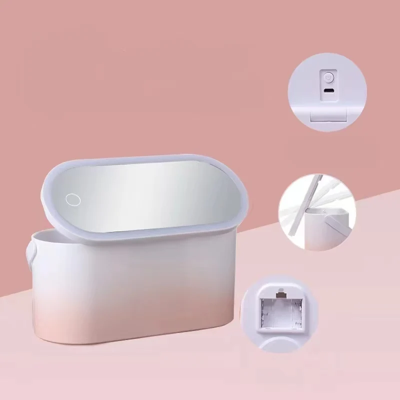 Caja organizadora de maquillaje con espejo de luz LED, organizador de cosméticos de viaje portátil, almacenamiento de luz táctil, estuche de maquillaje