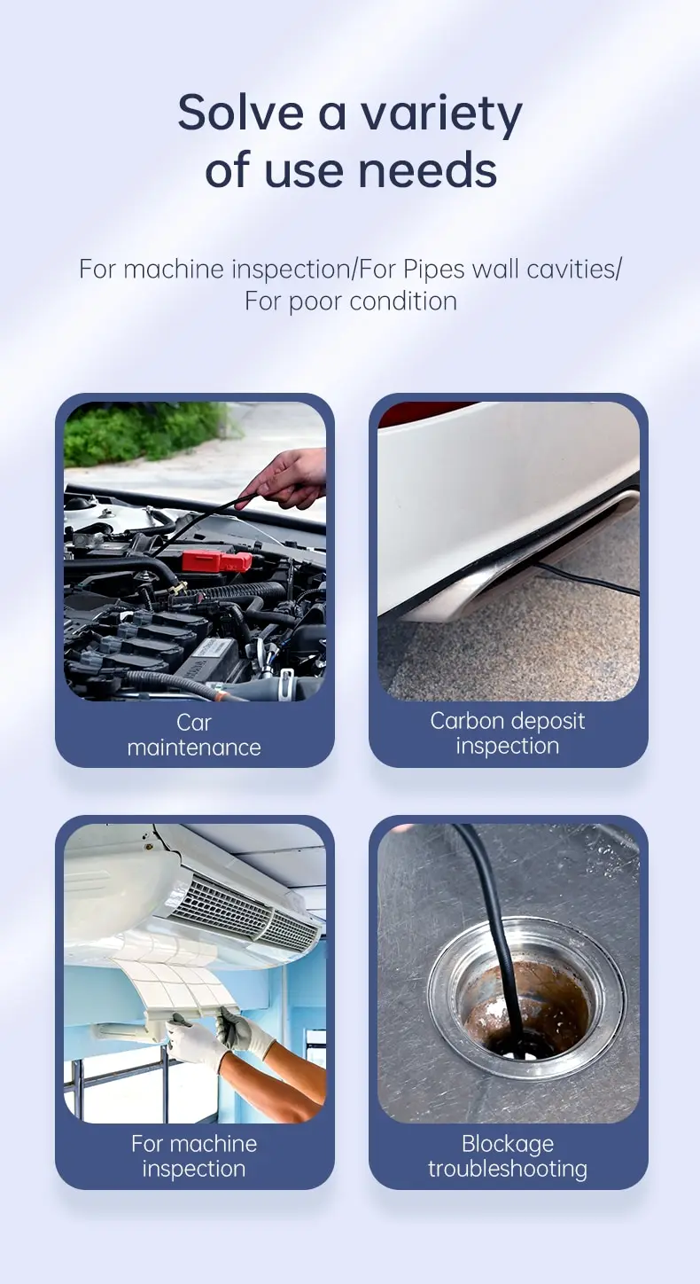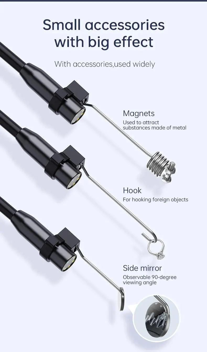• Uso versátil :Ideal para la reparación de automóviles, la inspección de plomería y otras tareas profesionales, este endoscopio es una herramienta versátil para diversas aplicaciones.