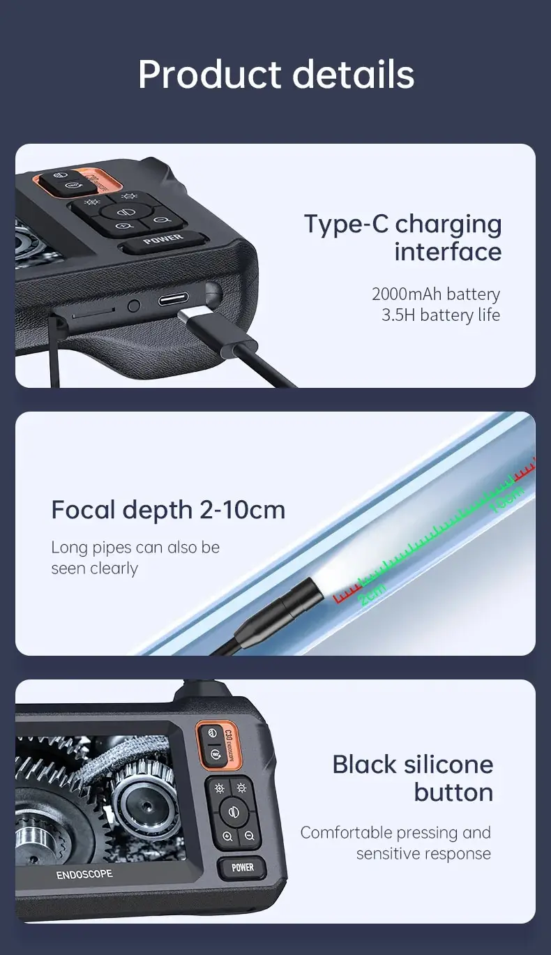 • Cámara de alta definición :Capture imágenes claras y detalladas con la cámara 1080P HD, perfecta para tareas de inspección y reparación.