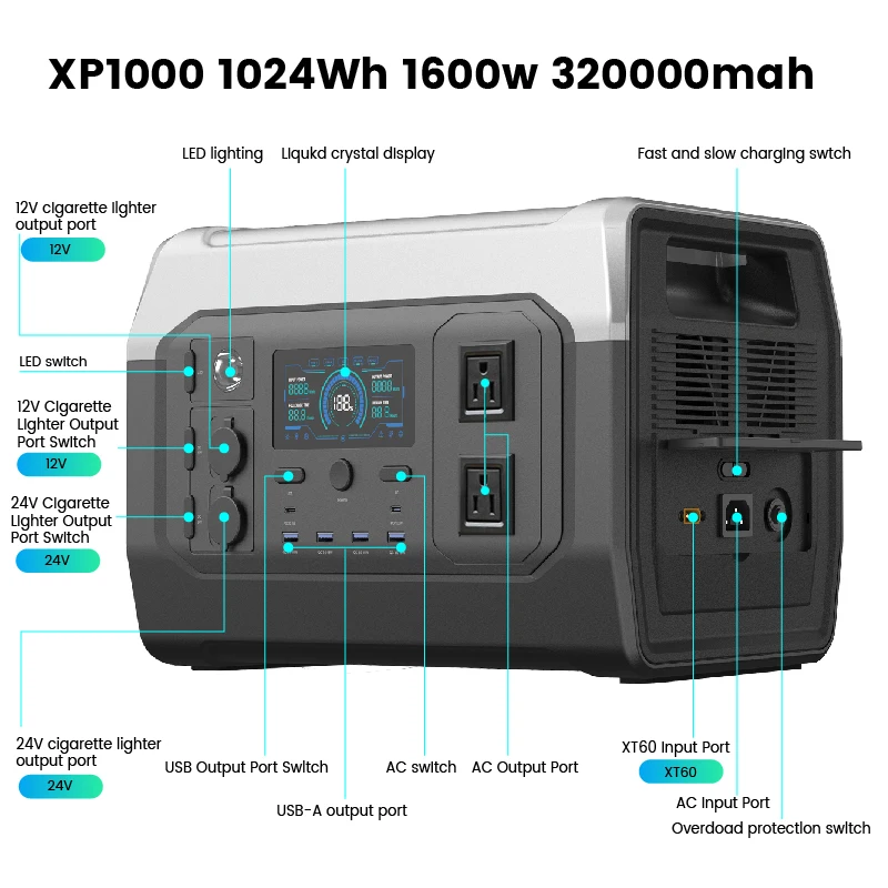 Especificaciones de la central eléctrica portátil XP1000 1024Wh 1600W como se muestra a continuación