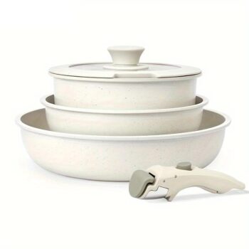 Juego de utensilios de cocina antiadherentes blancos de 5 piezas con asas desmontables: ollas y sartenes apilables para acampar y cocinar en el hogar