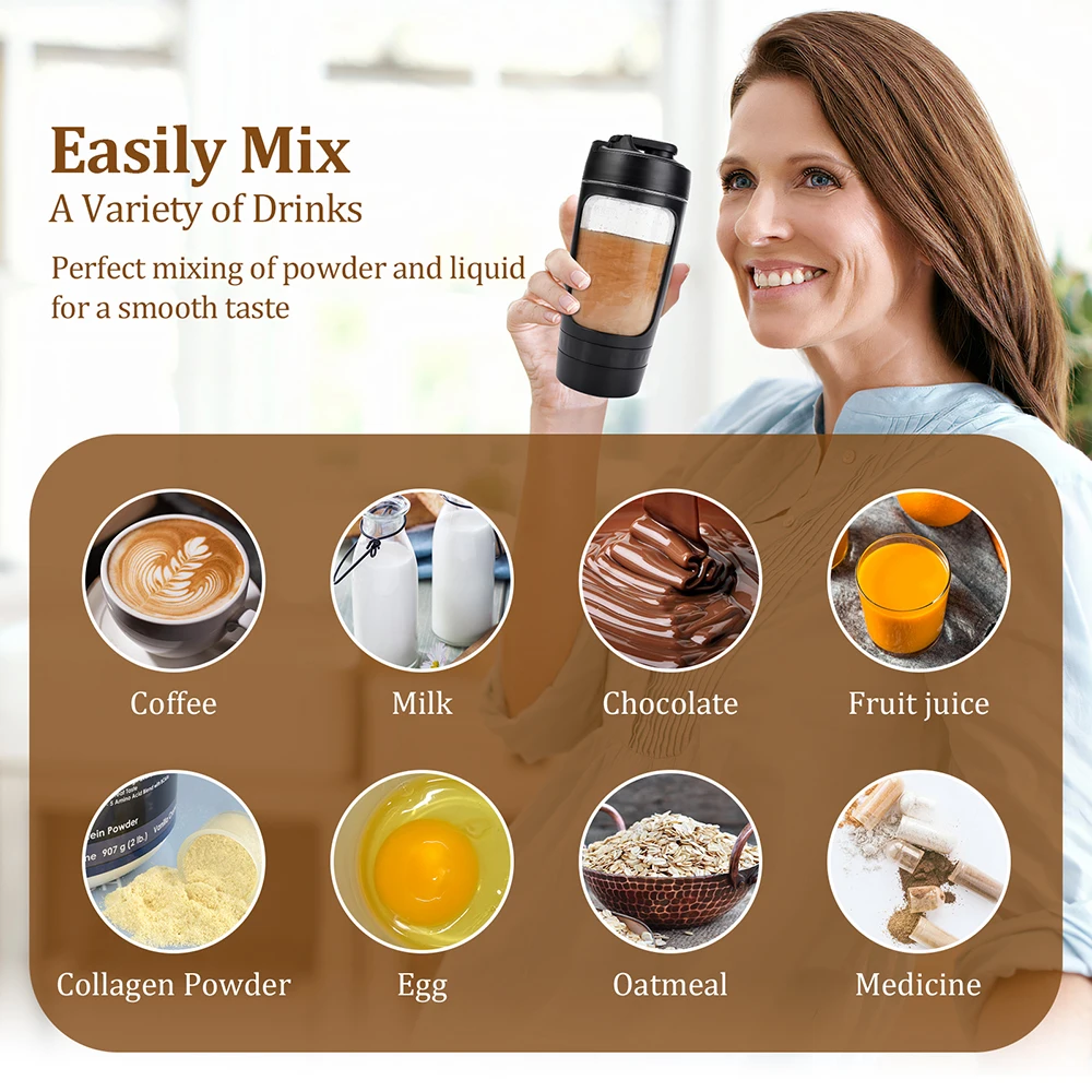 1. Mezcle fácilmente una variedad de bebidas.Mezcla perfecta de polvo y líquido para un sabor suave.Se puede utilizar en enzimas en polvo, café en polvo, soja en polvo, leche en polvo, jugo verde, avena, frijoles rojos y fideos de arroz de trabajo, probióticos, huevos, colágeno en polvo, polvo farmacéutico, polvo de repuesto de comida.