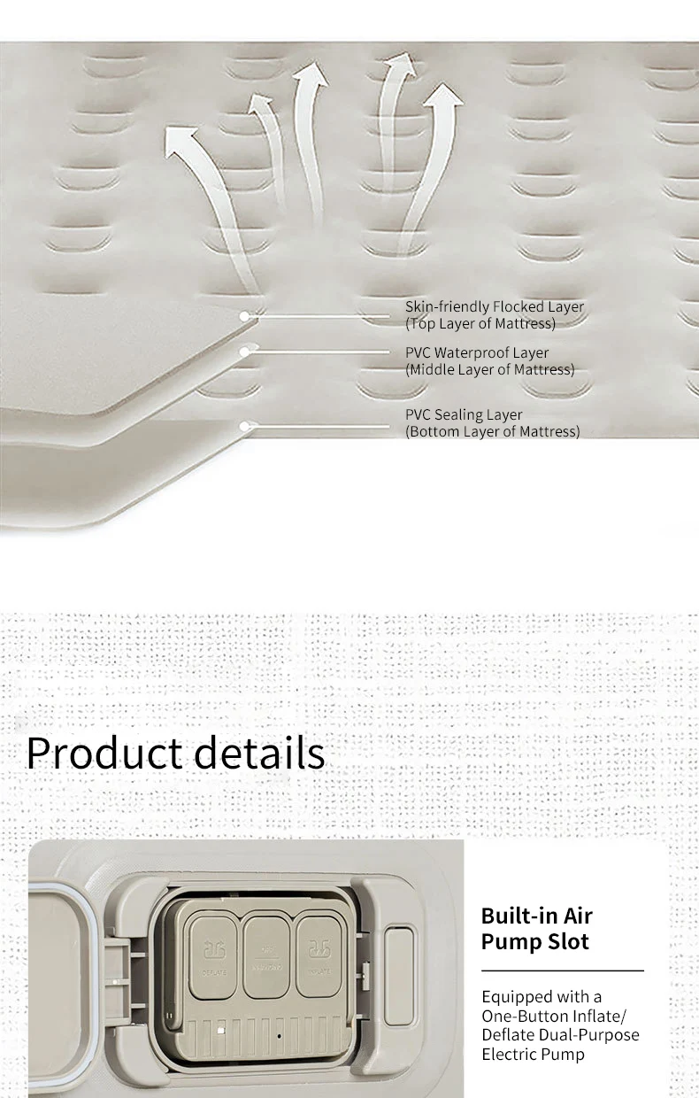 2. Preste atención a los cambios climáticos y al principio de expansión y contracción con la temperatura. En temperaturas más frías, la cama inflable puede volverse blanda; asegúrese de rellenar el aire. En temperaturas excesivamente altas, el colchón inflable puede inflarse y deformarse demasiado, por lo que es necesario un desinflado oportuno.
