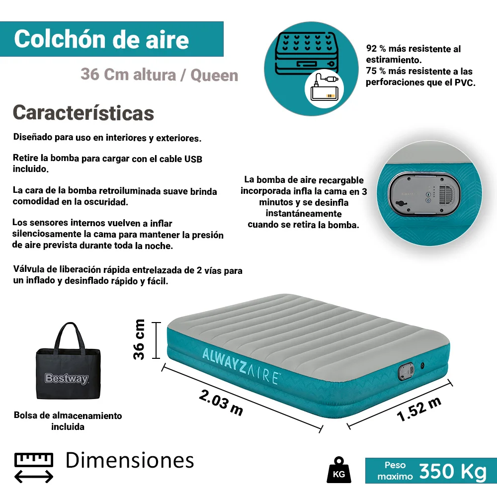 – Medidas de la cama inflable: (LAxANxAL) 203x152x36 cm. Capacidad de peso: 300 kg.