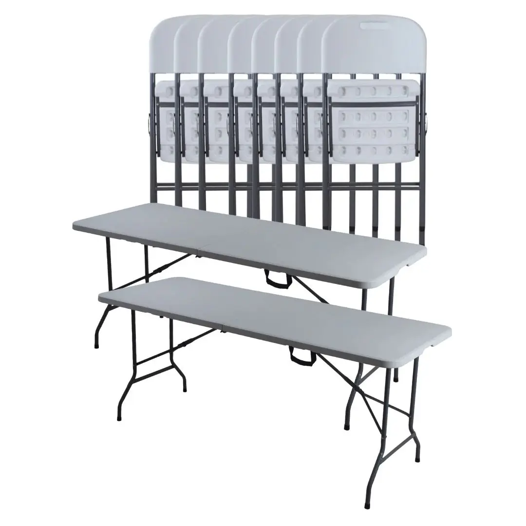 • Incluye 2 mesas plegables blancas de 180 cm y 8 sillas plegables blancas resistentes.