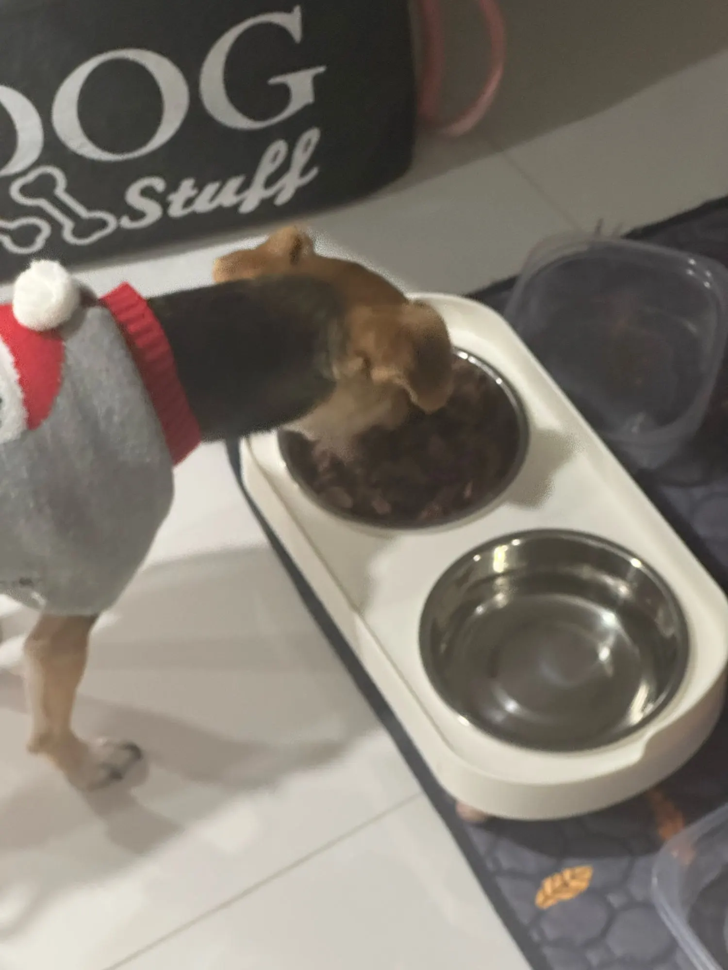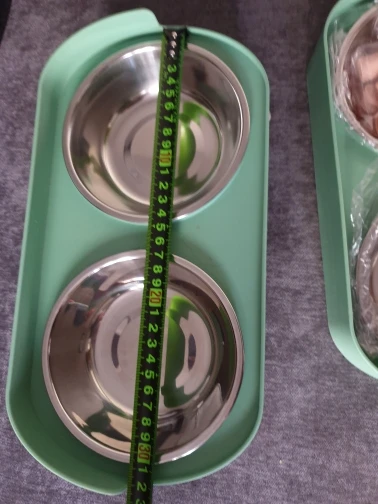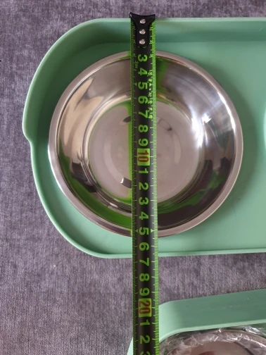 Muy feliz, hermoso Material de excelente calidad Los tazones están hechos de acero. Los pies tienen almohadillas de goma para evitar que se deslicen. Mi cachorro mide 29 cm de altura. Envío muy rápido