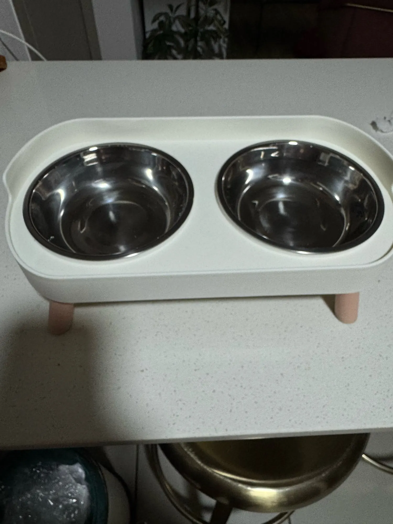 Buen comedero y bebedero. La estructura es de plástico y los recipientes son metálicos. El paquete incluye unas pequeñas pegatinas con almohadillas para la base de las patas