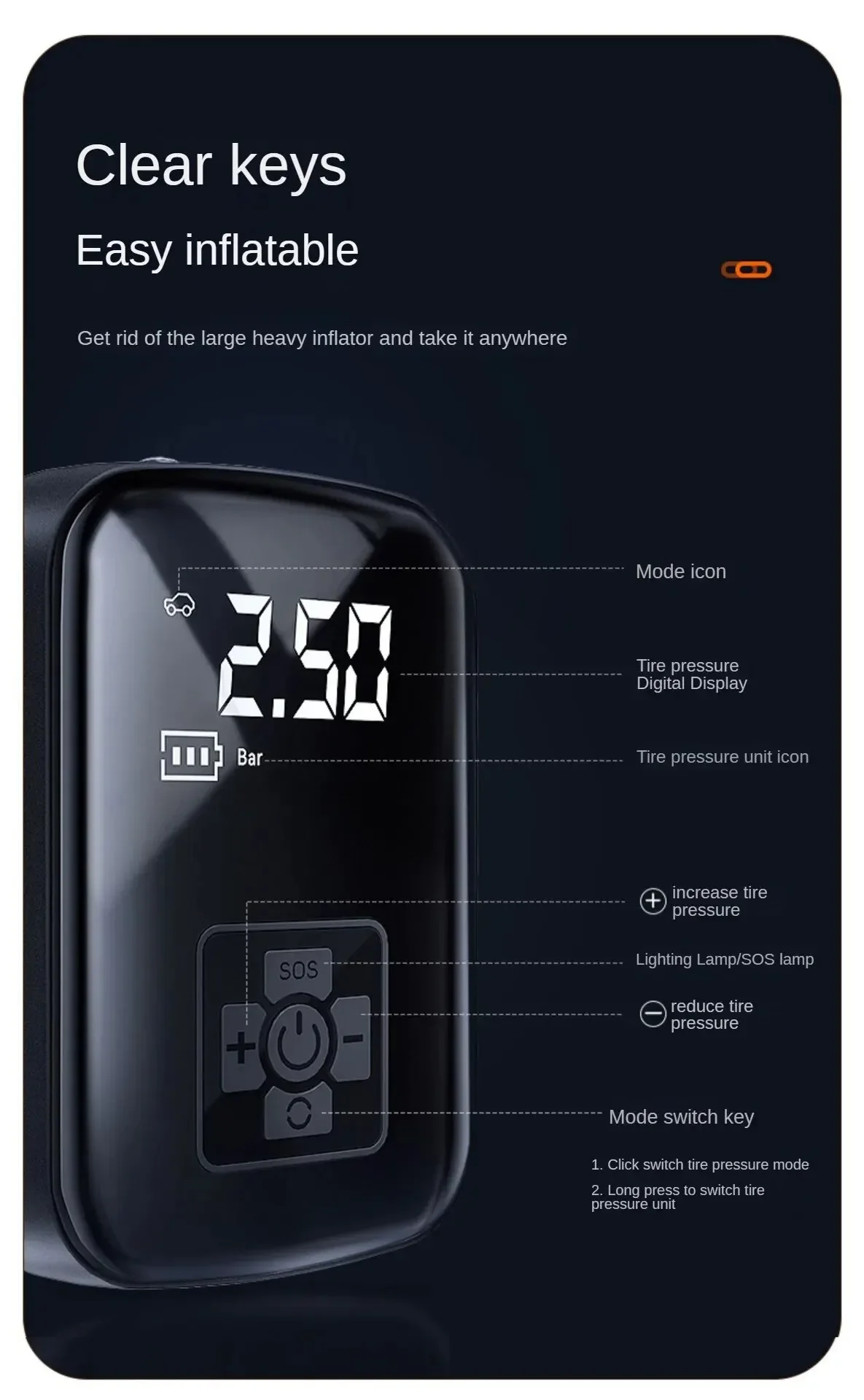 • Inalámbrico y conveniente:No necesita cables ni cables, este compresor de aire es fácil de usar y se puede llevar a cualquier parte.