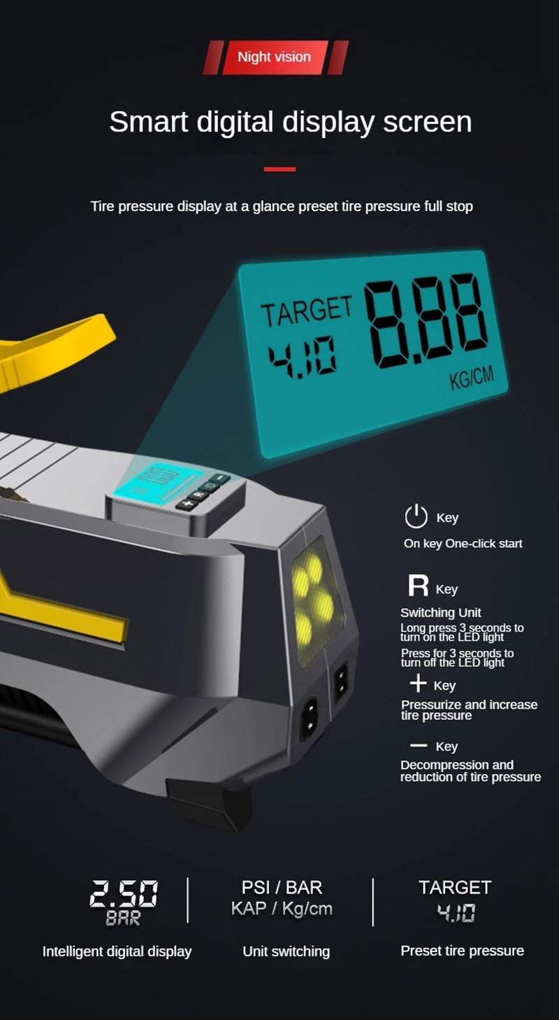Funciones del producto: inflado/iluminación/medición de presión/presión de neumáticos preestablecida
