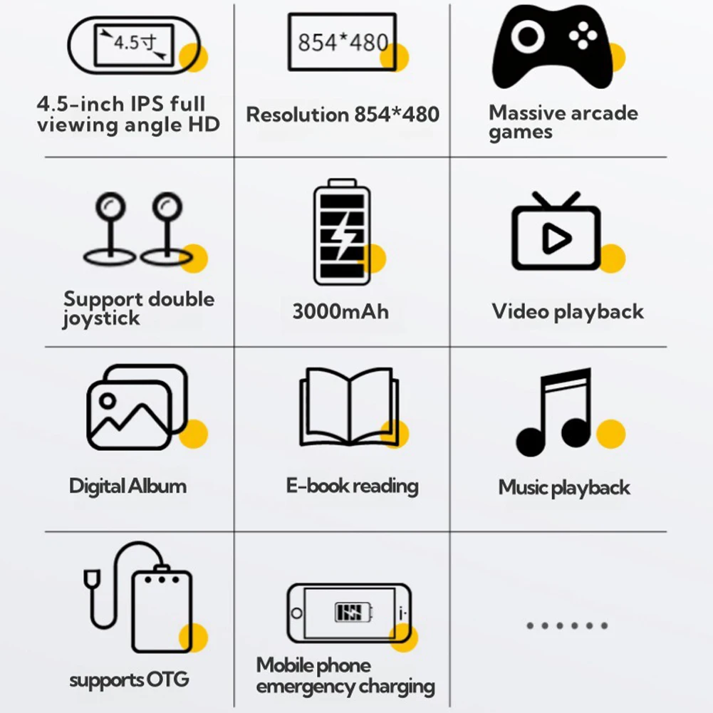 Preinstalada con más de 30.000 juegos clásicos, esta consola de juegos portátil admite múltiples plataformas, incluidas MAME, PS1, FC, SFC y GBC.Disfruta de la amplia colección de juegos retro en diferentes consolas. 2.Pantalla de alta calidad: La consola de juegos retro cuenta con una pantalla IPS HD de 4,5 pulgadas para obtener imágenes de juego nítidas.Viene con una tarjeta TF de 64G para almacenar más videojuegos y guardar el progreso del juego.Incluye una batería recargable incorporada de 3000 mAh para 4-5 horas de juego continuo. 3.Soporte para múltiples emuladores: Esta consola de videojuegos portátil retro es compatible con emuladores como MAME, PS1, FC, SFC y GBC.Cambie sin problemas entre bibliotecas de juegos de diferentes consolas con facilidad utilizando las convenientes operaciones de este jugador. 4. Funcionalidad versátil: Ofreciendo más que un simple sistema de juegos, este versátil reproductor de juegos actúa como un lector de libros electrónicos, un reproductor de video y un cargador de teléfono de emergencia.Está equipado para satisfacer sus necesidades prácticas y de entretenimiento dondequiera que esté. 5. Elección de regalo perfecta: Esta consola de juegos portátil es un regalo ideal para familiares y amigos en cumpleaños, Navidad, Año Nuevo y otras festividades.La jugabilidad competitiva ofrece entretenimiento interactivo, brindando risas y alegría a toda la familia. Especificación: Origen: China continental Nota:
