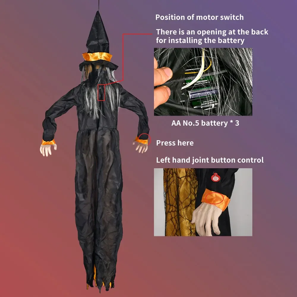 3.Complemento perfecto para la decoración de Halloween: colgar bruja parlante animada es perfecto para fiestas temáticas de Halloween.Ya sea que se use como decoración interior o exterior o se incorpore a una casa embrujada, su diseño único hará de su casa la atención de la ciudad.