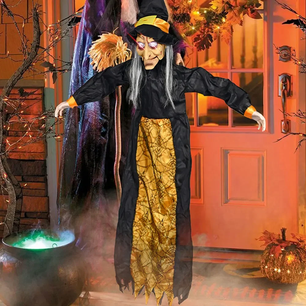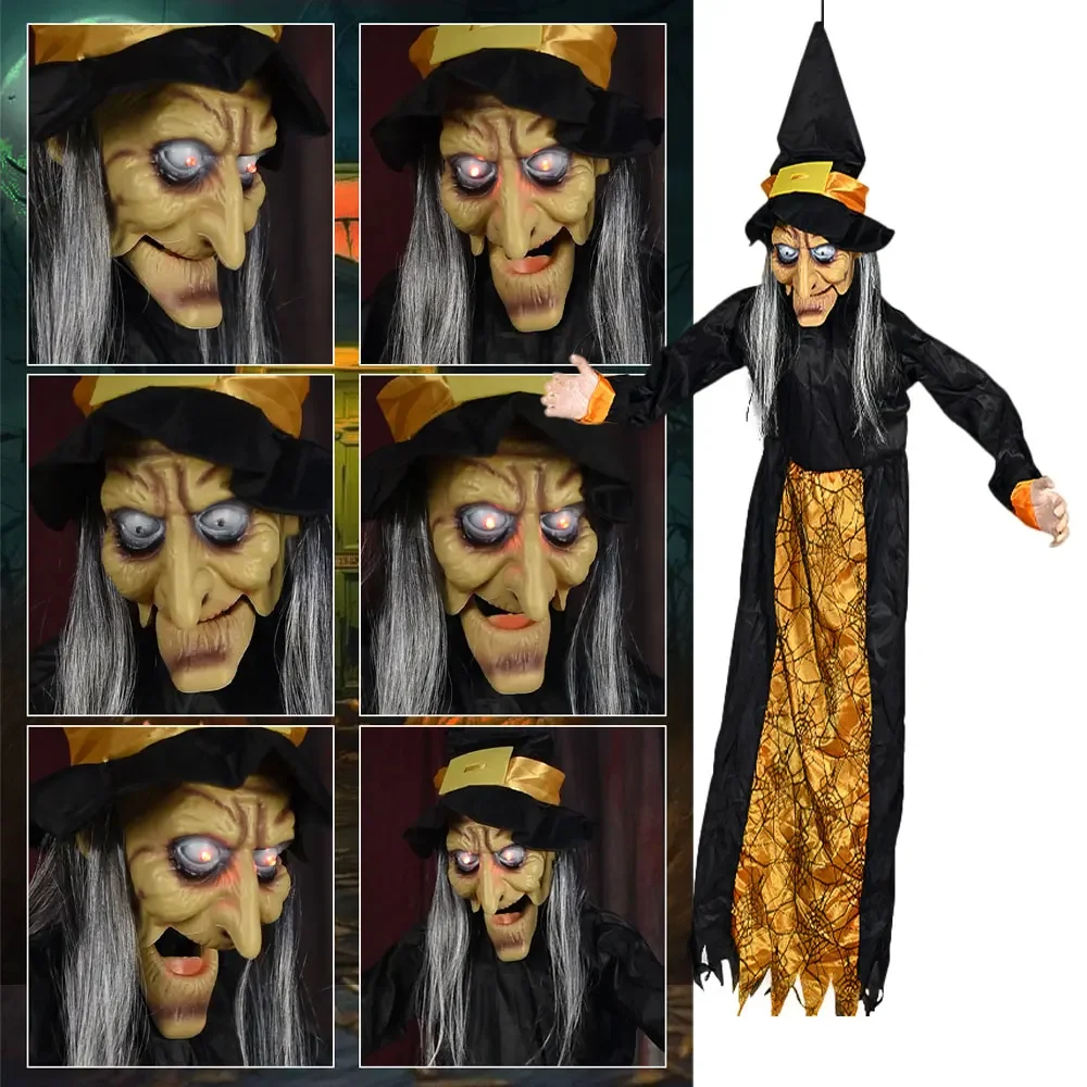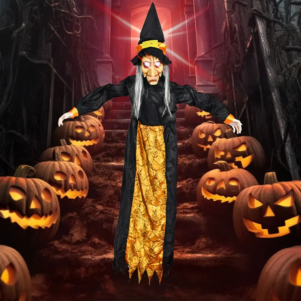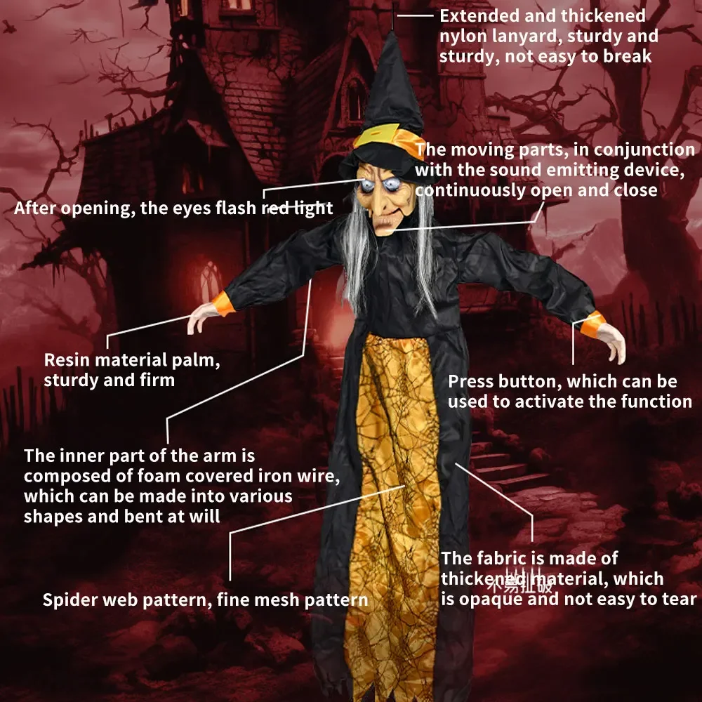 1.Bruja de Halloween que levanta el pelo: con ojos brillantes y un sonido llamativo activado, los accesorios colgantes de bruja crean una atmósfera escalofriante y aterradora.Incluso si estás consciente de su presencia, buscarla accidentalmente puede hacerte gritar.