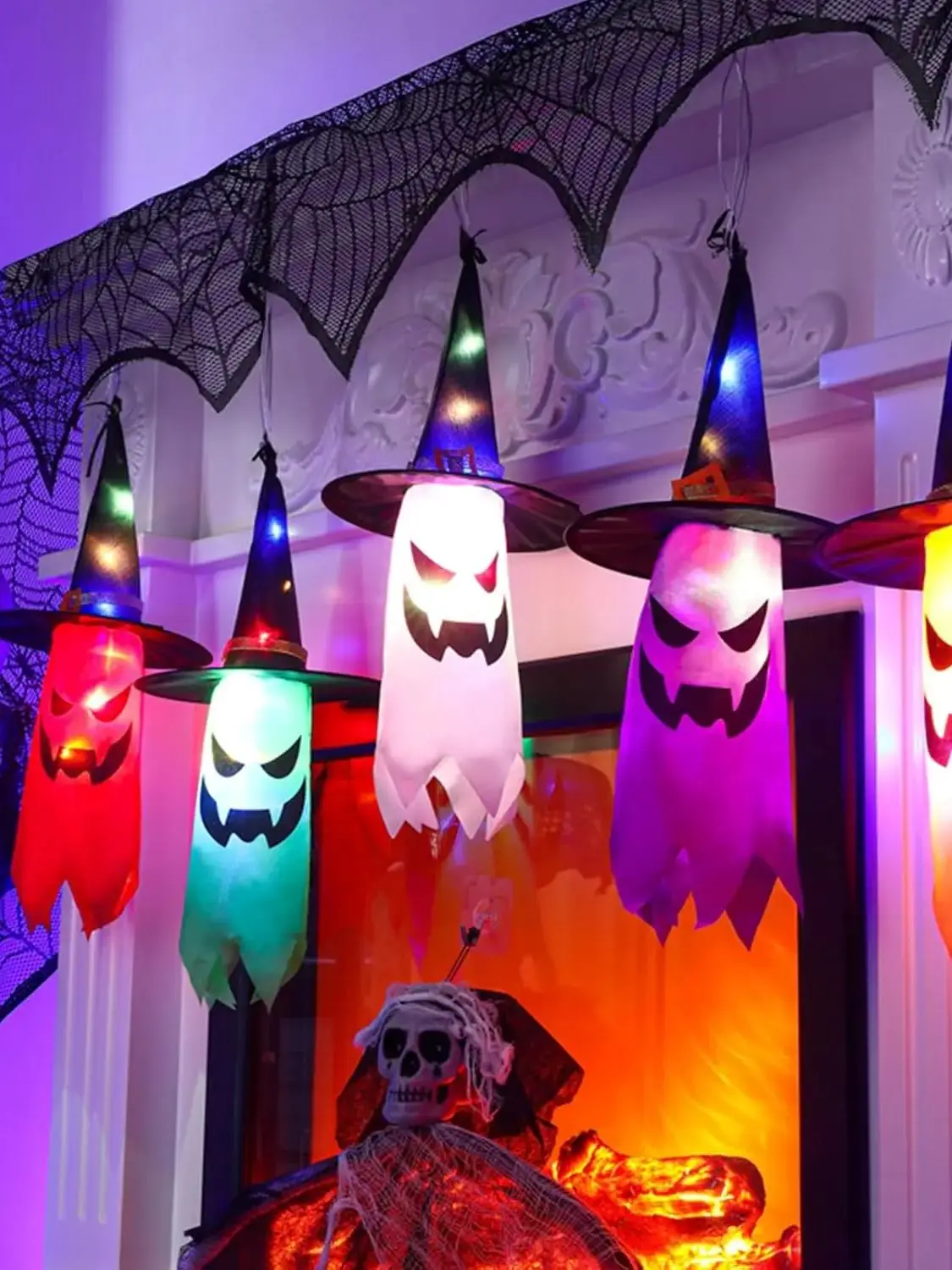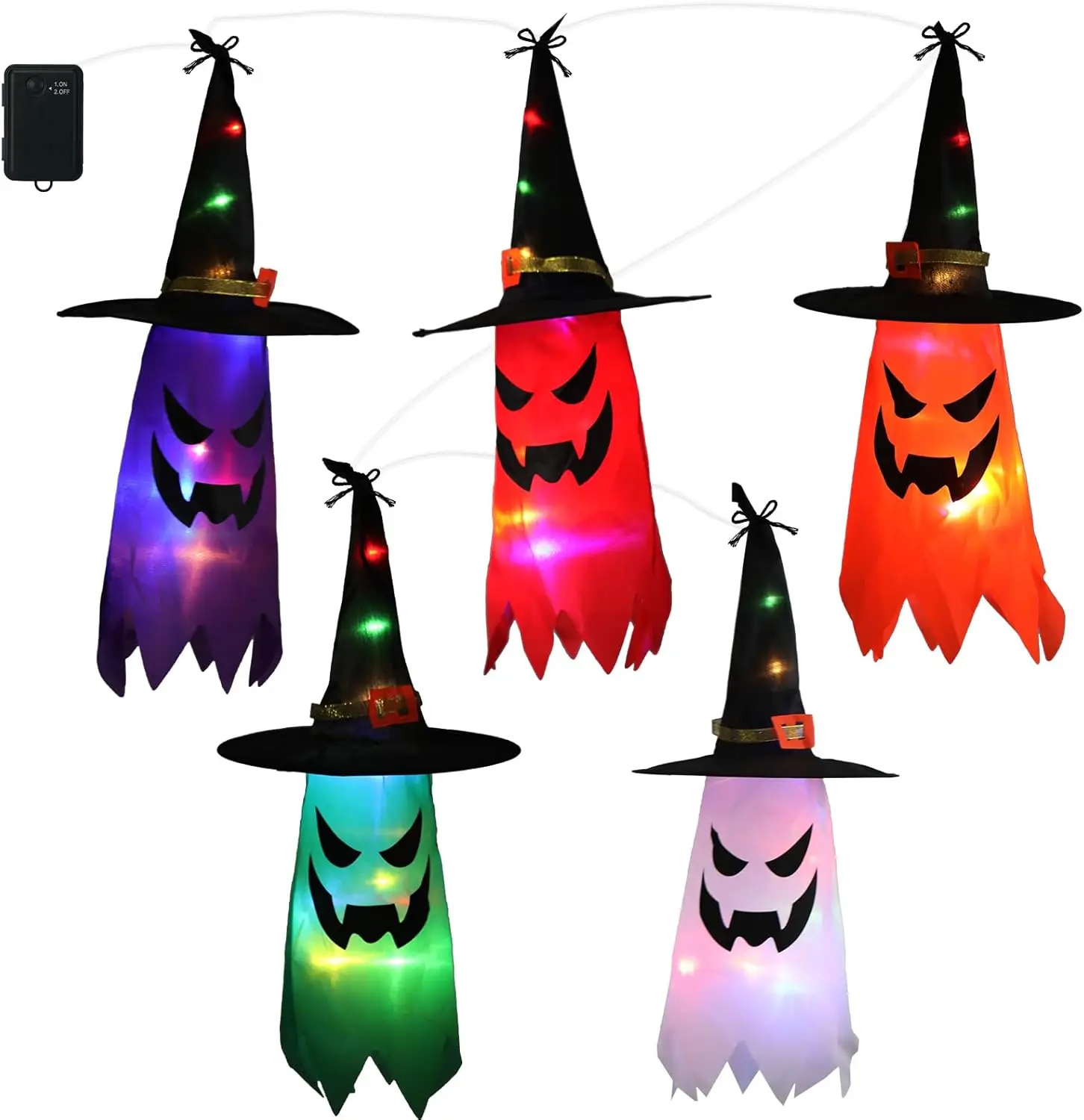 Decoraciones de Halloween para exteriores, 5 piezas colgantes, sombrero de bruja fantasma brillante iluminado con luces LED de cadena para fiesta y jardín