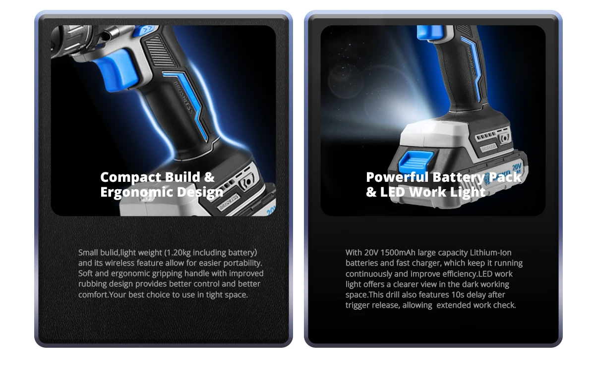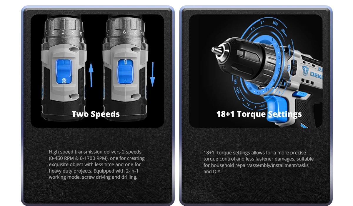 SET2: 1 * Taladro Inalámbrico sin escobillas DEKO, 2*1,5 Ah 20V batería de iones de litio, 1 * cargador rápido