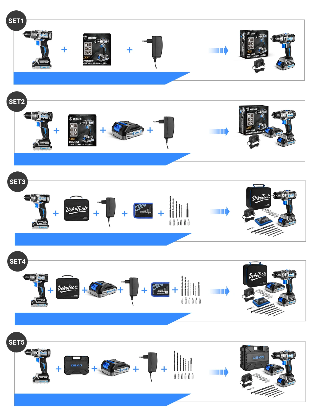 SET5: 1 Taladro Inalámbrico sin escobillas DEKO, 2 pilas de iones de litio de 1,5 Ah 20V, 1 cargador rápido, 13 accesorios, 1 caja BMC.