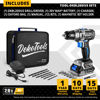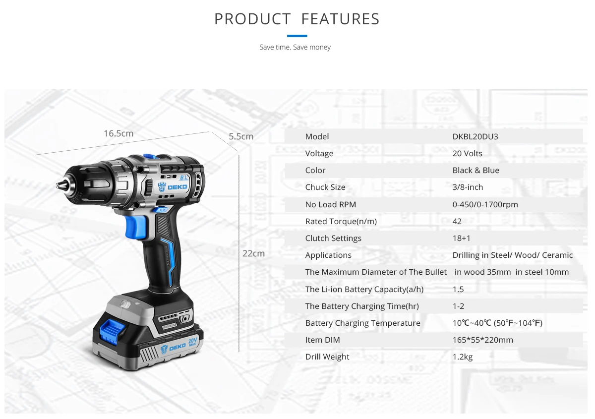 SET4: 1 Taladro Inalámbrico sin escobillas DEKO, 2 pilas de iones de litio de 1,5 Ah 20V, 1 cargador rápido, 13 accesorios, 1 bolsa de algodón Oxford.