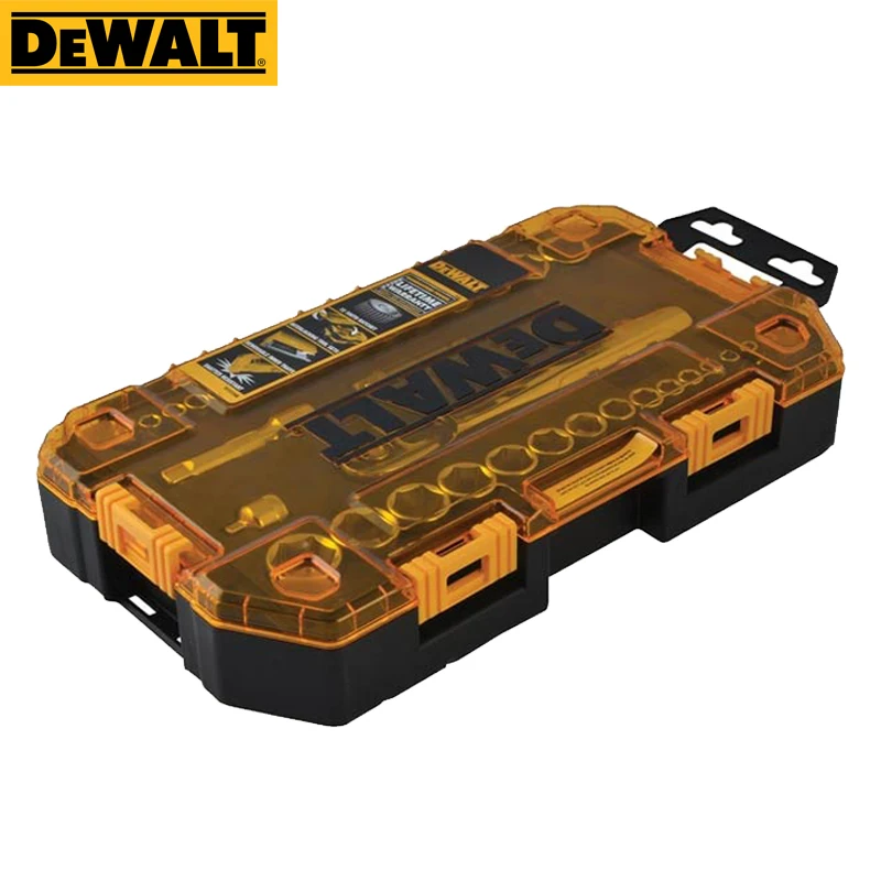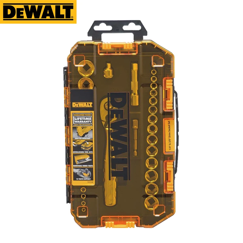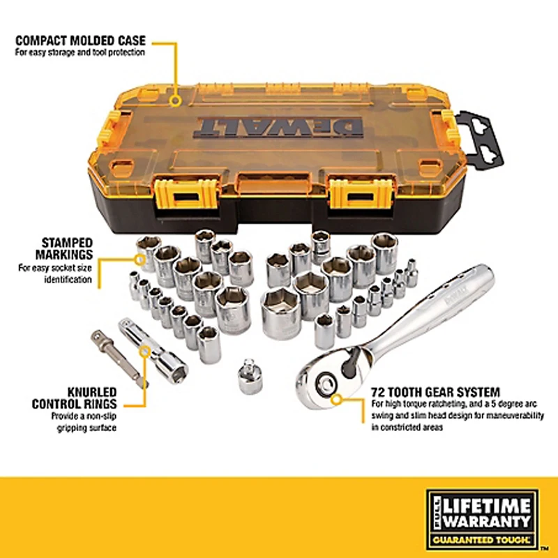 ●This 34 pc. Socket Set is a versatile set that can be easily transported between work areas. This set features a removable inner tray designed to fit in most tool chests with standard height drawers. It also has side hinges that interlock with similar DEWALT(R) mechanics tool sets for an organized storage solution. Included in this set is a 72 tooth count ratchet, great for accessing tough to reach spots found on a worksite. The sockets and wrenches have hard stamped markings to easily identify the tool you need.