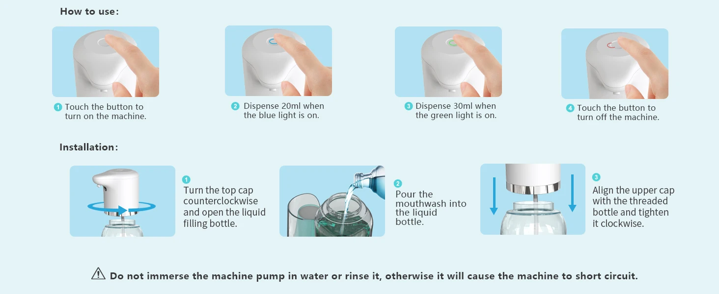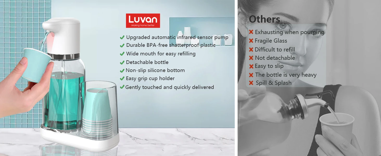 ★Bomba de enjuague bucal eléctrica mejorada– El dispensador automático de enjuague bucal para baño tiene un motor incorporado de alta velocidad y un sensor infrarrojo preciso.Cuando coloca el vaso de papel debajo del sensor y toca el pequeño botón de gota de agua, la bomba de enjuague bucal eléctrica mejorada detectará y dispensará con precisión la cantidad de líquido que desea, minimizando obstrucciones, desperdicios, derrames y fugas.