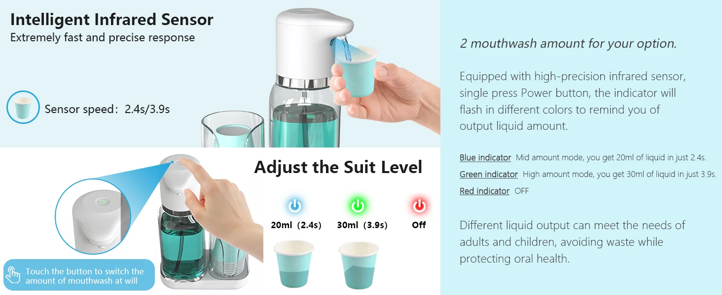 Sensor infrarrojo automáticoEquipado con un sensor infrarrojo de alta precisión, puede dispensar enjuague bucal de forma automática y sencilla, adecuado para que toda la familia proteja su boca. |