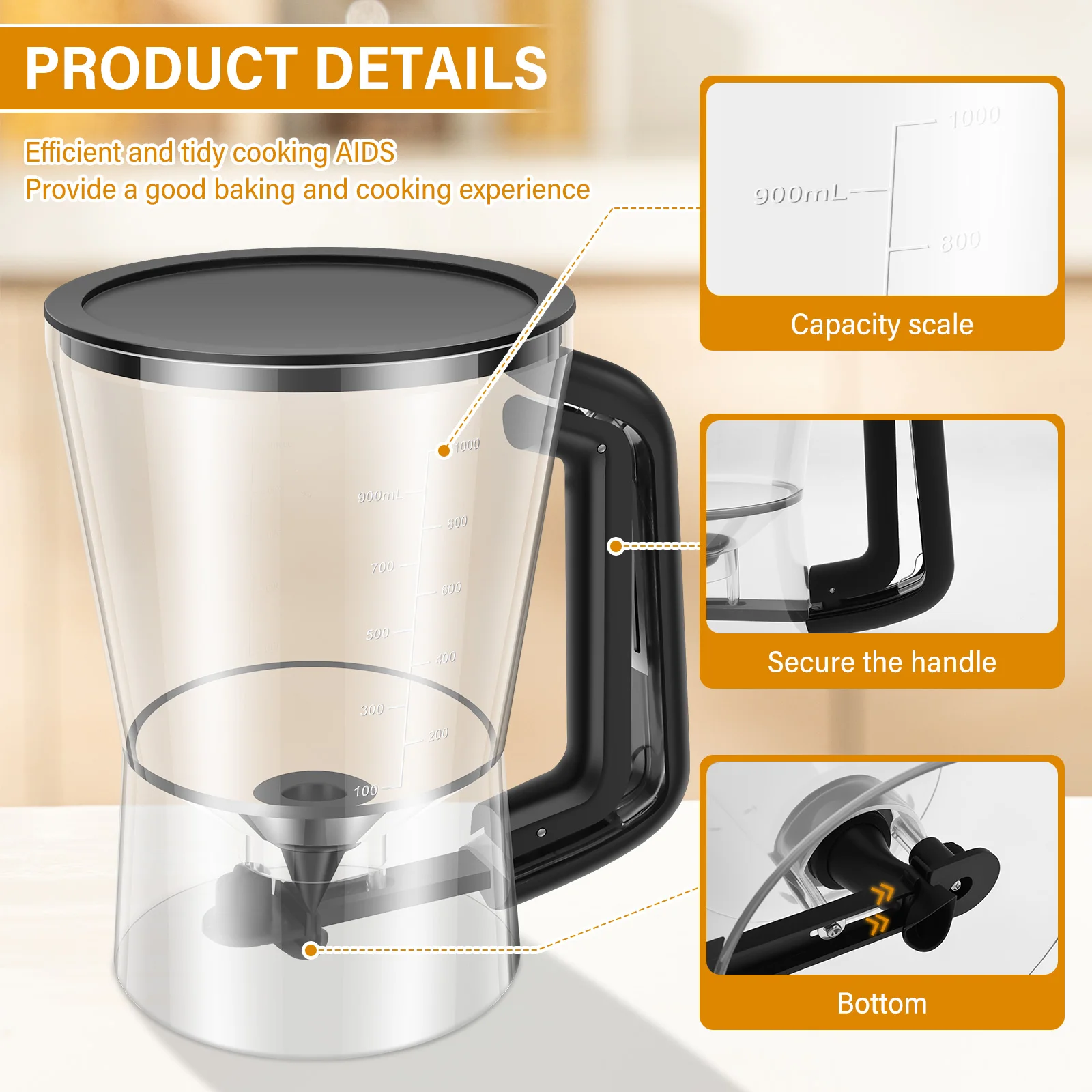 【3 tazas de gran capacidad】Este dispensador de masa para pasteles adopta 3 tazas de gran capacidad, adecuado para reuniones familiares o reuniones con amigos.La amplia apertura en la parte superior permite verter y mezclar fácil y rápidamente la masa para panqueques, cupcakes o gofres, lo que reduce la necesidad de recargas y mejora la eficiencia de la cocción.