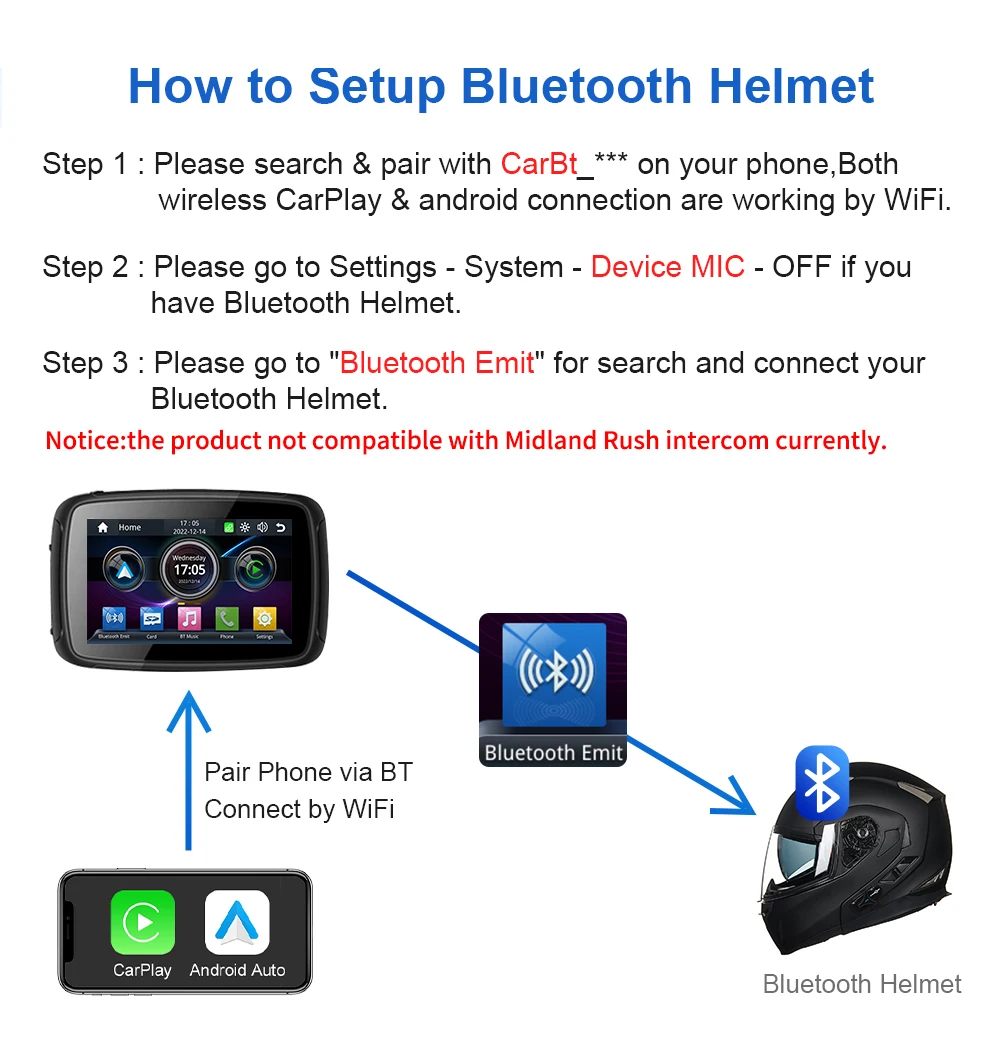 A: Yes, you’re able to listen all the audio via bluetooth headset/helmet(music, navi etc) by pairing it to C5 Carplay, and you can make the phonecalls by it . It supports Sena, NEXT Pro, Amazon Echoshow 5 etc, But its not compatible with Miland intercom currently.