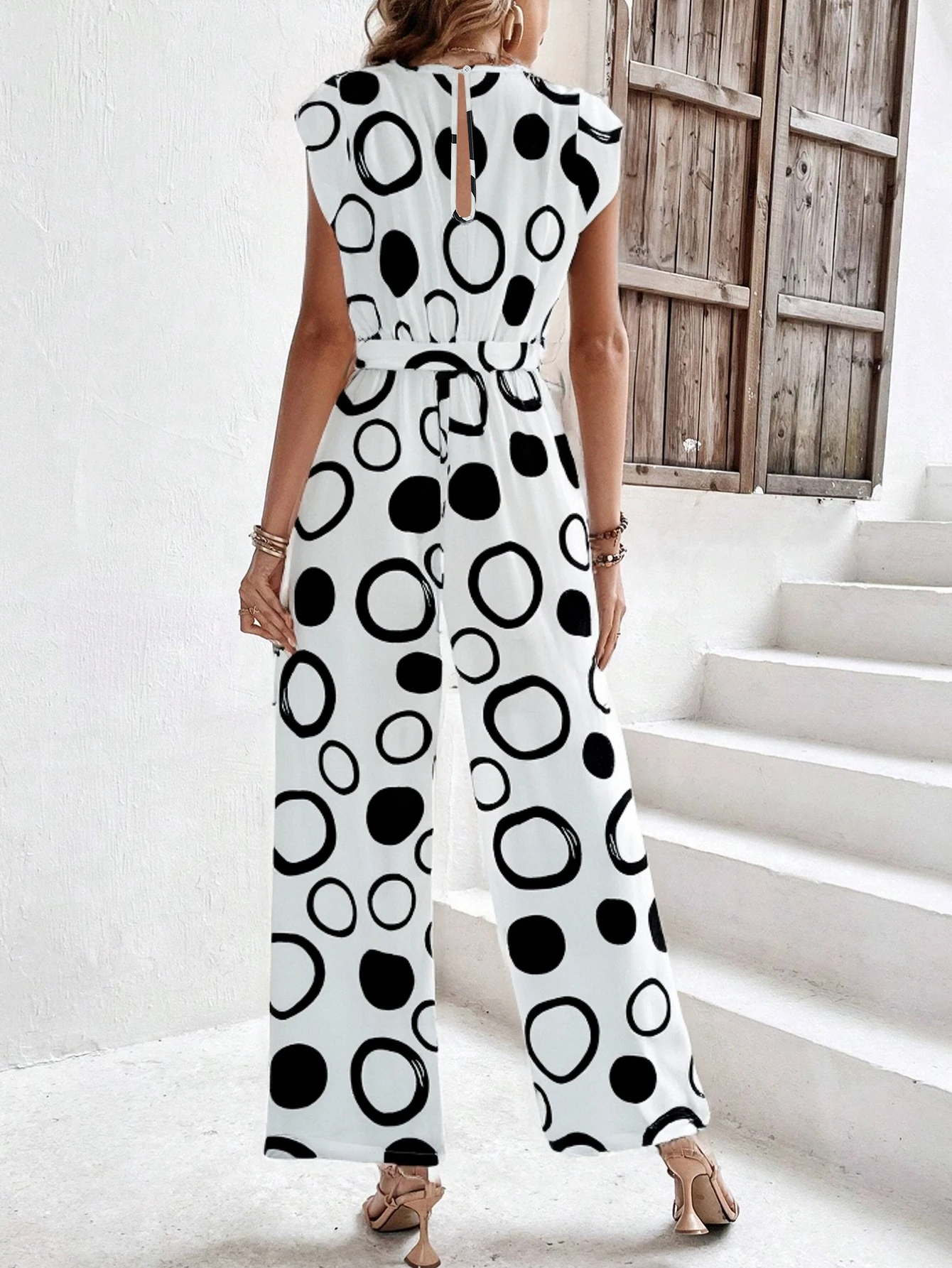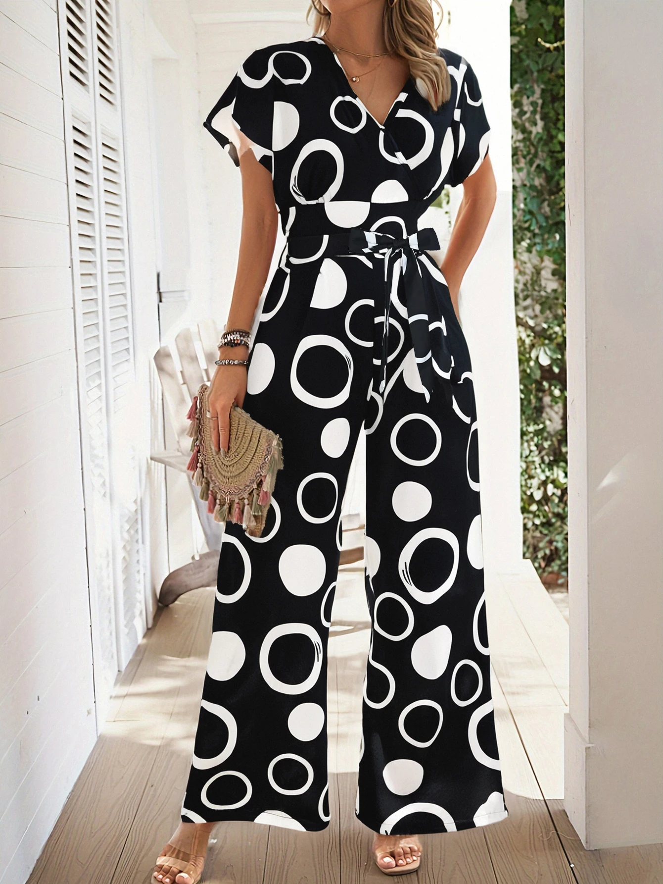 Elegante Mono De Pierna Ancha Para Mujer,Monos Larga De Estampado De manga Corta Con Cinturón
