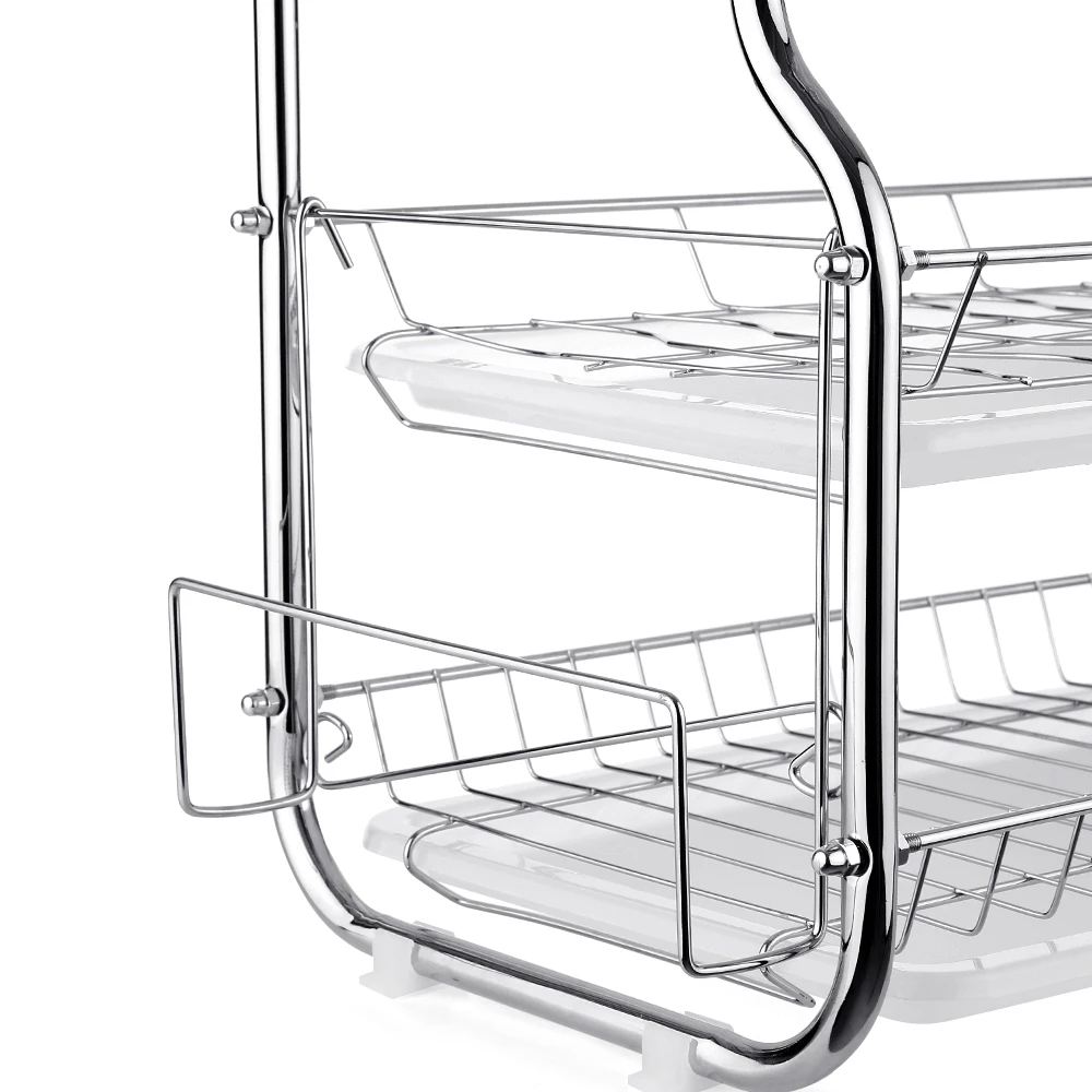 Este estante para platos de 3 niveles cuenta con una construcción robusta y un diseño que ahorra espacio, marco de aleación cromado con bandeja extraíble fácil de limpiar y soporte para cubiertos. Puede usar el nivel superior para platos, el nivel inferior para platillos, tazas, cuencos, etc., el estante lateral para la tabla de cortar y el soporte para palillos. Mantenga su cocina limpia y ordenada.
