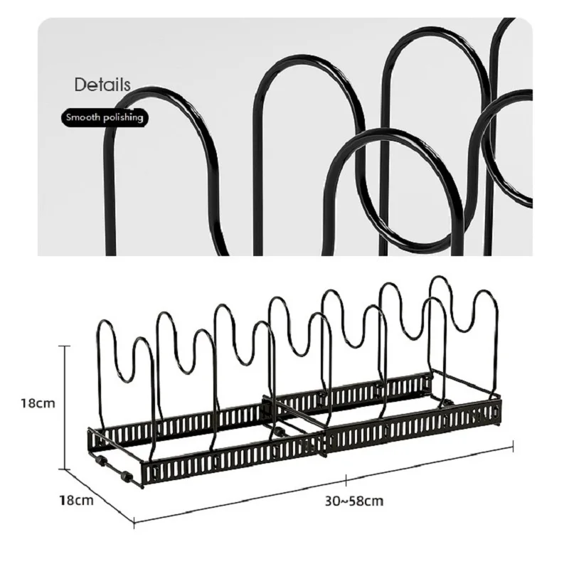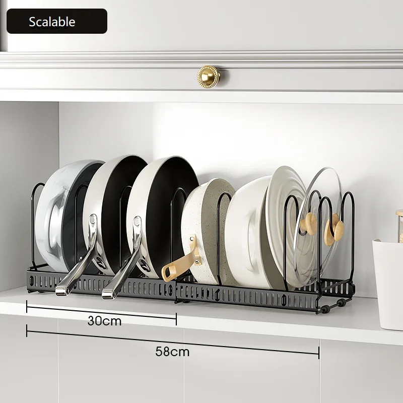2 métodos de bricolaje: Este estante para ollas tiene 2 métodos de bricolaje. Puede usarlo como un organizador extensible o como dos estantes de tapa de olla separados. La longitud puede expandirse fácilmente de 30cm a 58cm, lo que permite la flexibilidad de almacenar en una despensa, gabinete, debajo del fregadero o en la encimera.
