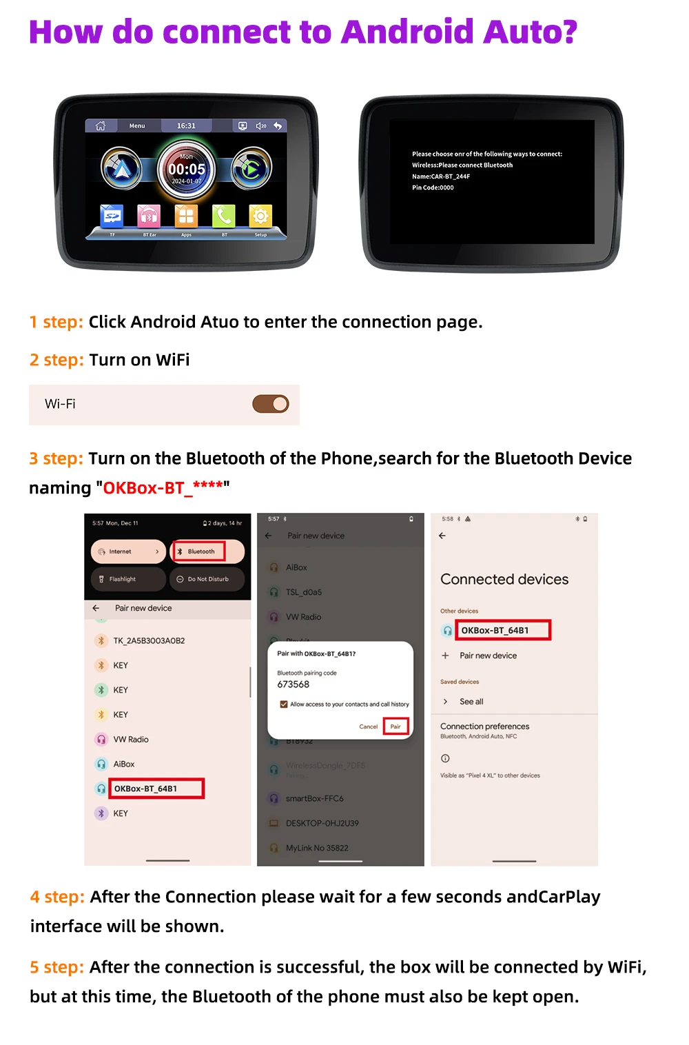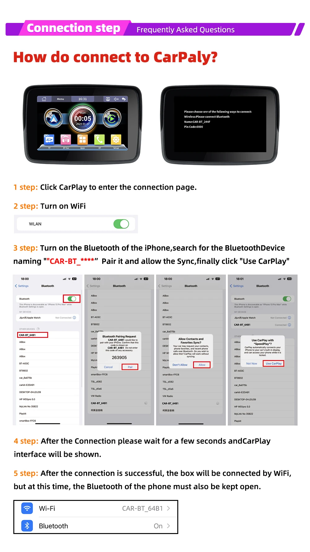 Acerca de la conexión Bluetooth: Carplay: Si no puede conectarse, vaya a la configuración del teléfono-general-carplay, elimine todos los dispositivos en él y luego conéctese de nuevo.