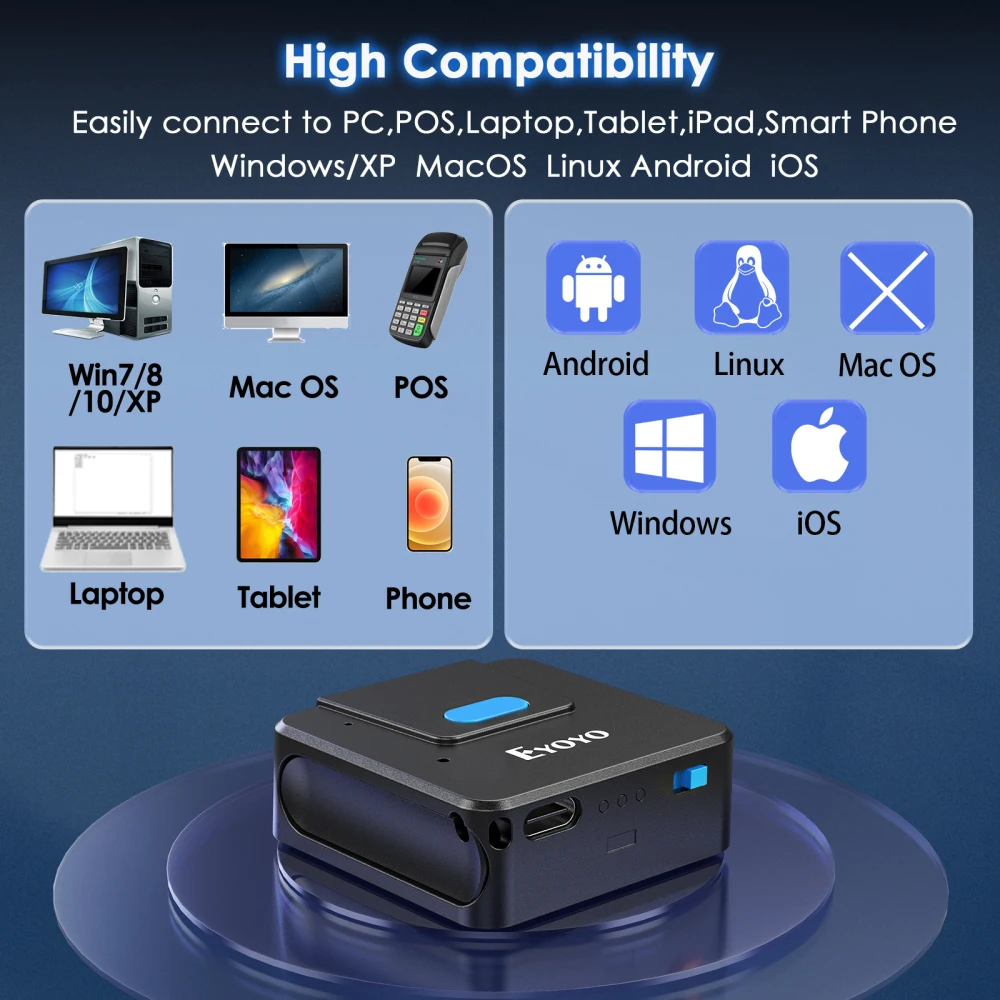 【Conexión Bluetooth y USB, inalámbrico y con cable libremente convertido】Mientras trabaja en una línea de flujo, manténgase dentro del rango de soporte Bluetooth y elija el modo de emparejamiento Bluetooth que se puede mover en cualquier momento. Mientras tanto, si no tiene un dispositivo habilitado para Bluetooth o trabaja en un turno sentado, puede conectar el escáner de código de barras a su computadora a través de un cable USB. En una palabra, el escáner inalámbrico Eyoyo admite la conexión con su computadora portátil, MAC, iPhone, Android y tableta.