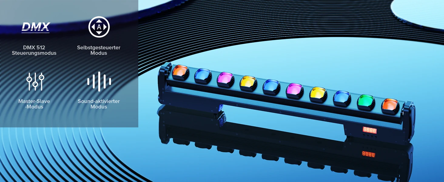 Modo de operación: autopropulsado, activado por voz, DMX512, maestro-esclavo