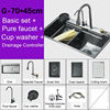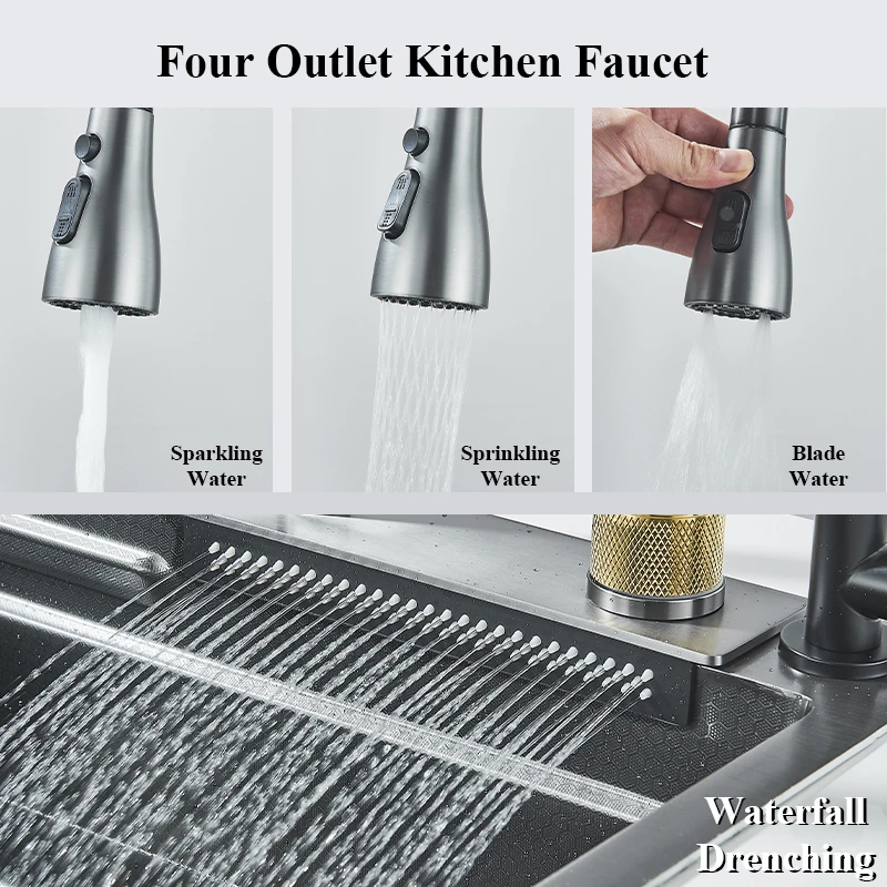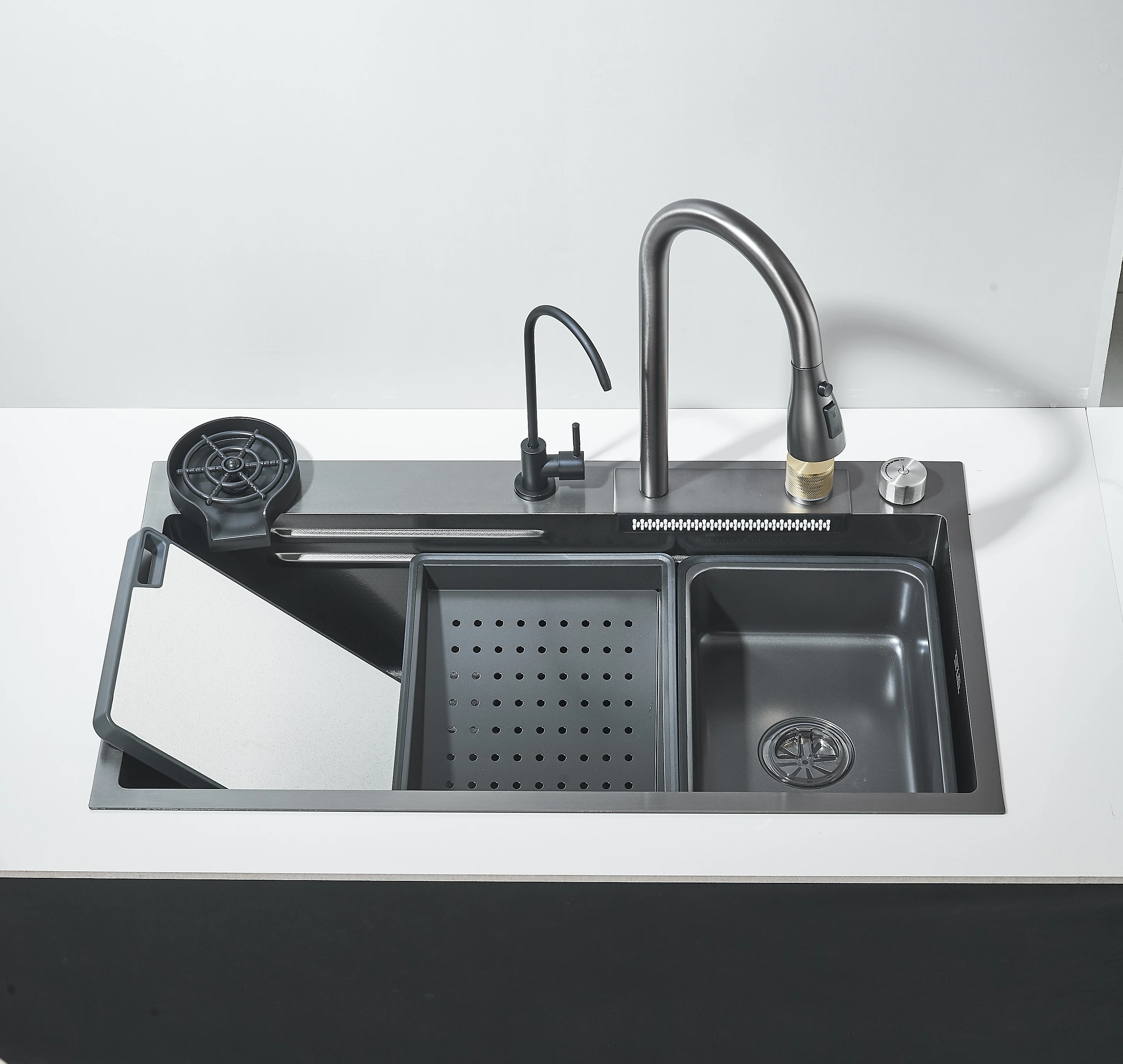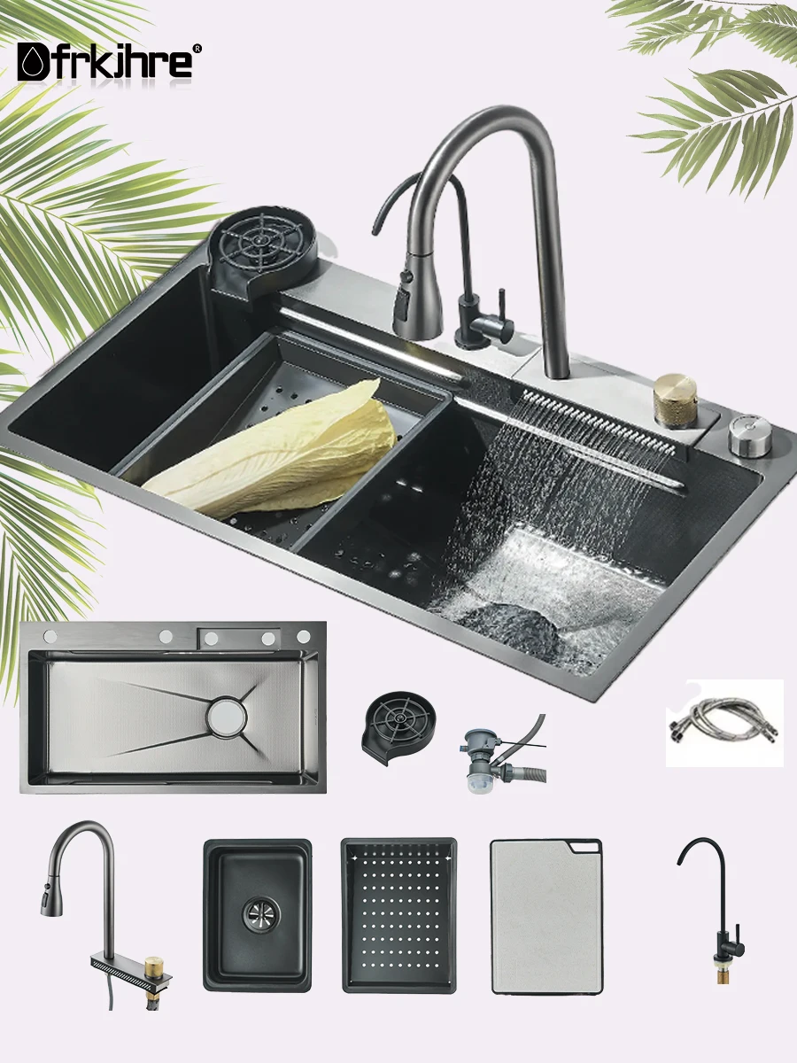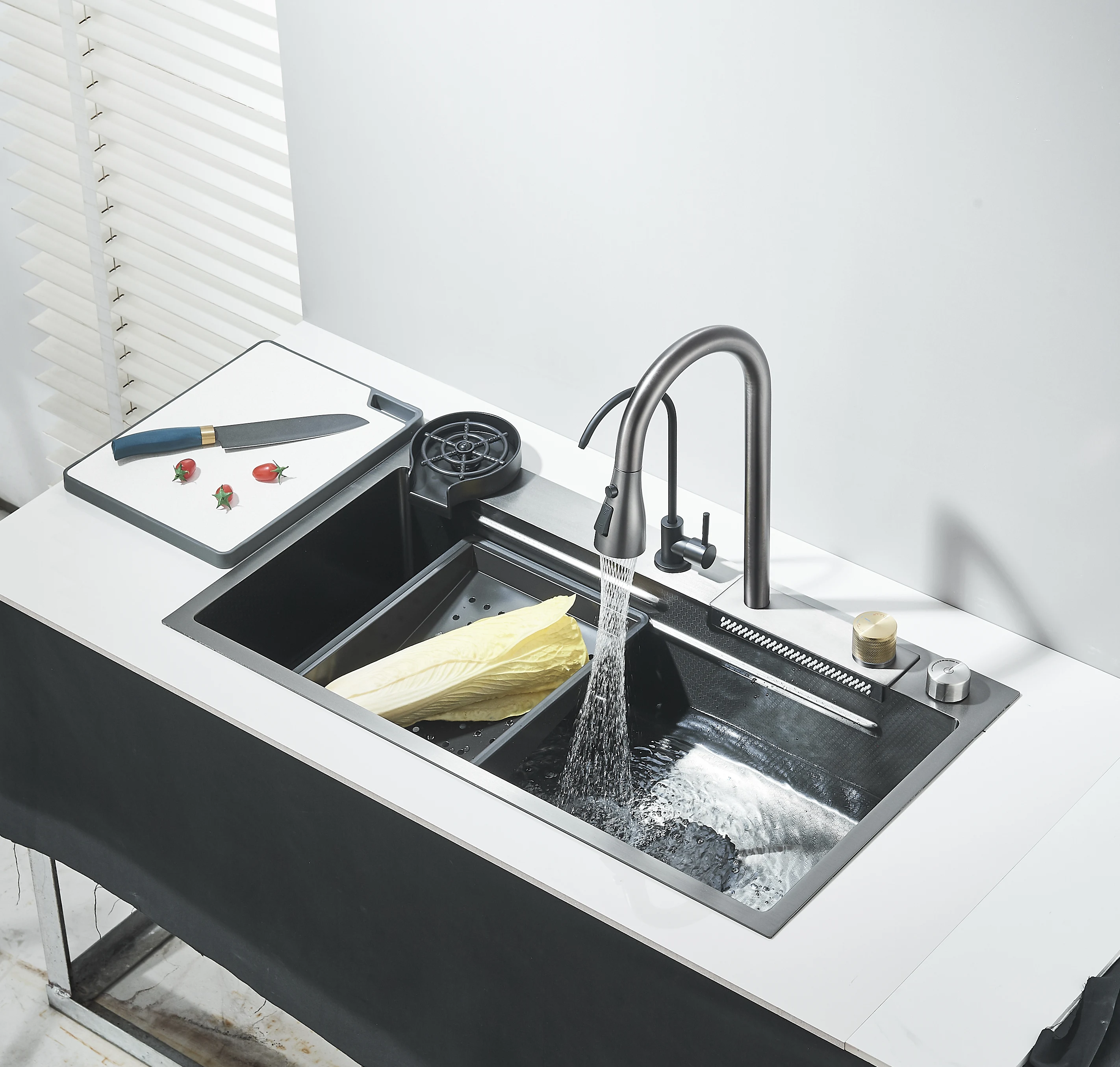 Fregadero de cocina multifunción de acero inoxidable 304, color gris/níquel cepillado, grifo de cascada, tazón individual grande, arandela de taza, grifo puro