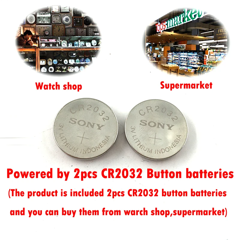 Powered by : 2 pcs CR2032 batteries(batteries included) .