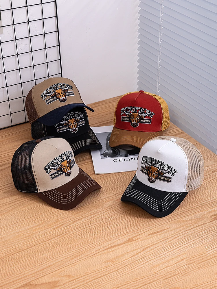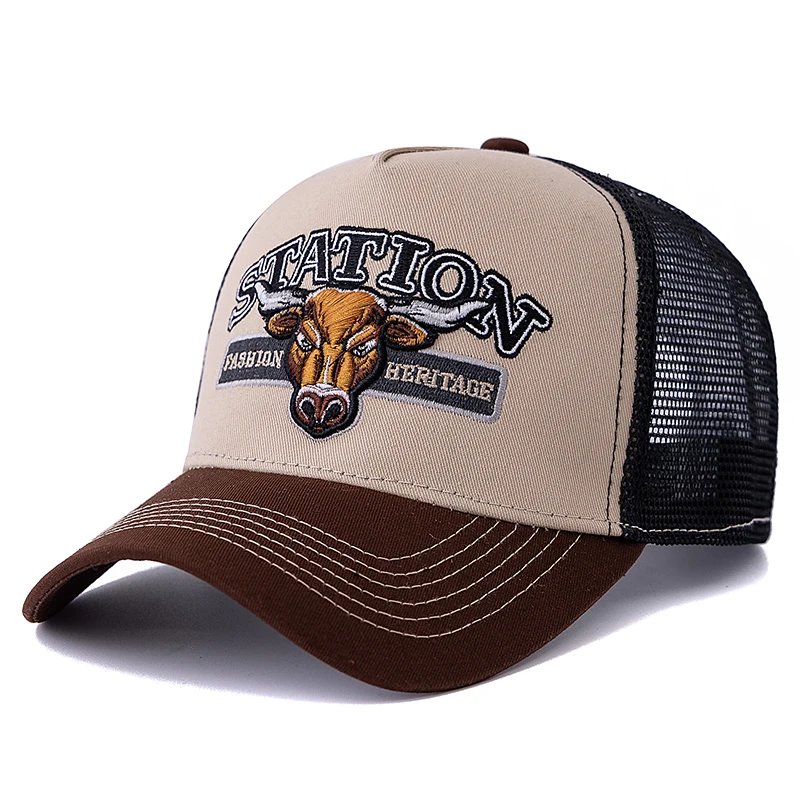 Gorra de camionero de malla transpirable de verano Unisex, gorra de béisbol con patrón de cabeza de toro, gorras Snapback ajustables para hombres y mujeres