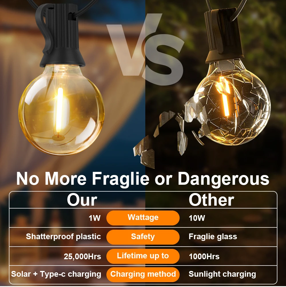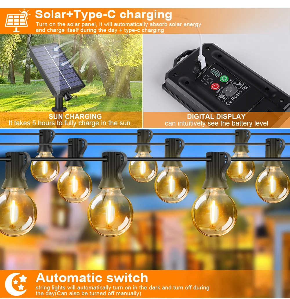 ·Recargable solar y por USB:Esta cadena de luces solares para exteriores nace para ser totalmente talentuada.Durante los días nublados, simplemente conéctelo a la toma USB tipo C.Sólo 3-4 horas de carga mantiene las luces encendidas hasta por 10-20 horas.