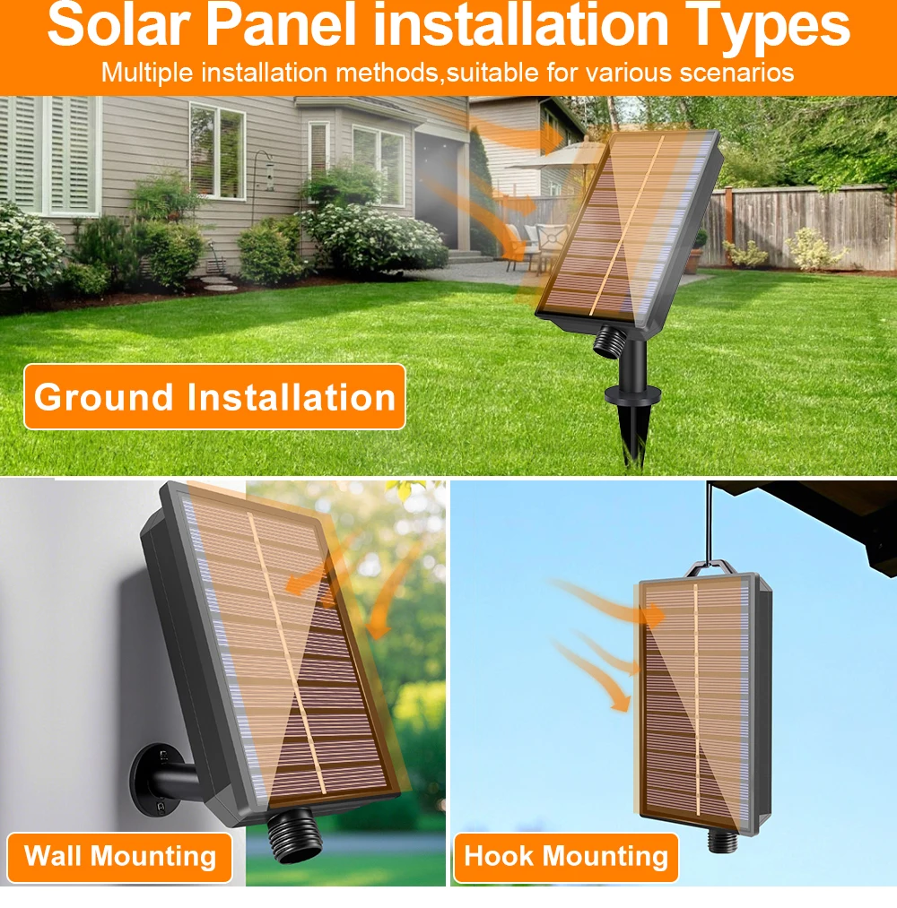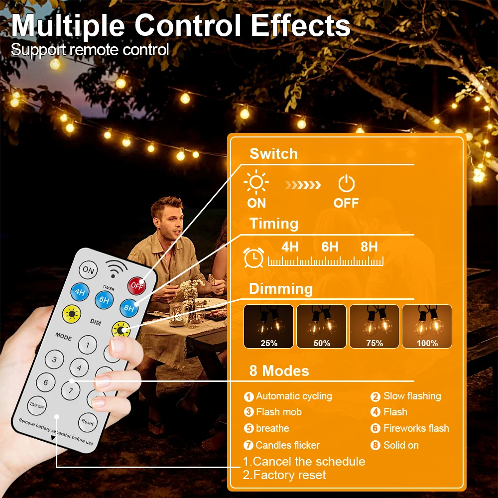 ·Encendido/apagado automático:Una vez encendidas, la cadena de luces alimentada por energía solar se encenderá automáticamente al atardecer para crear un brillo cálido y acogedor y se apagará al amanecer para ahorrar energía.No te molestes en encender o apagar manualmente repetidamente y ya no hay facturas de electricidad.