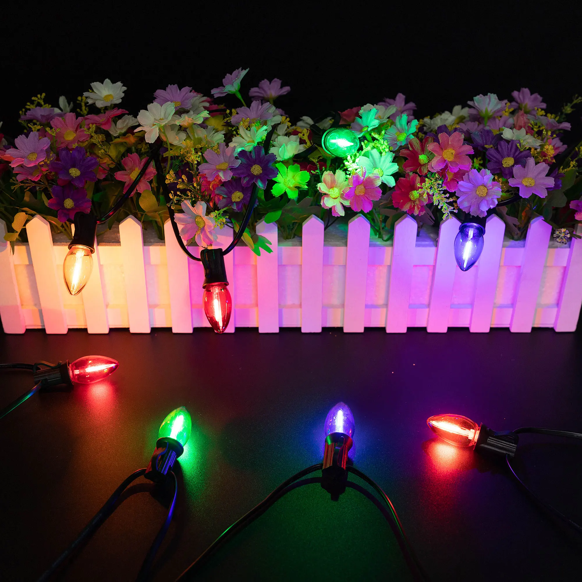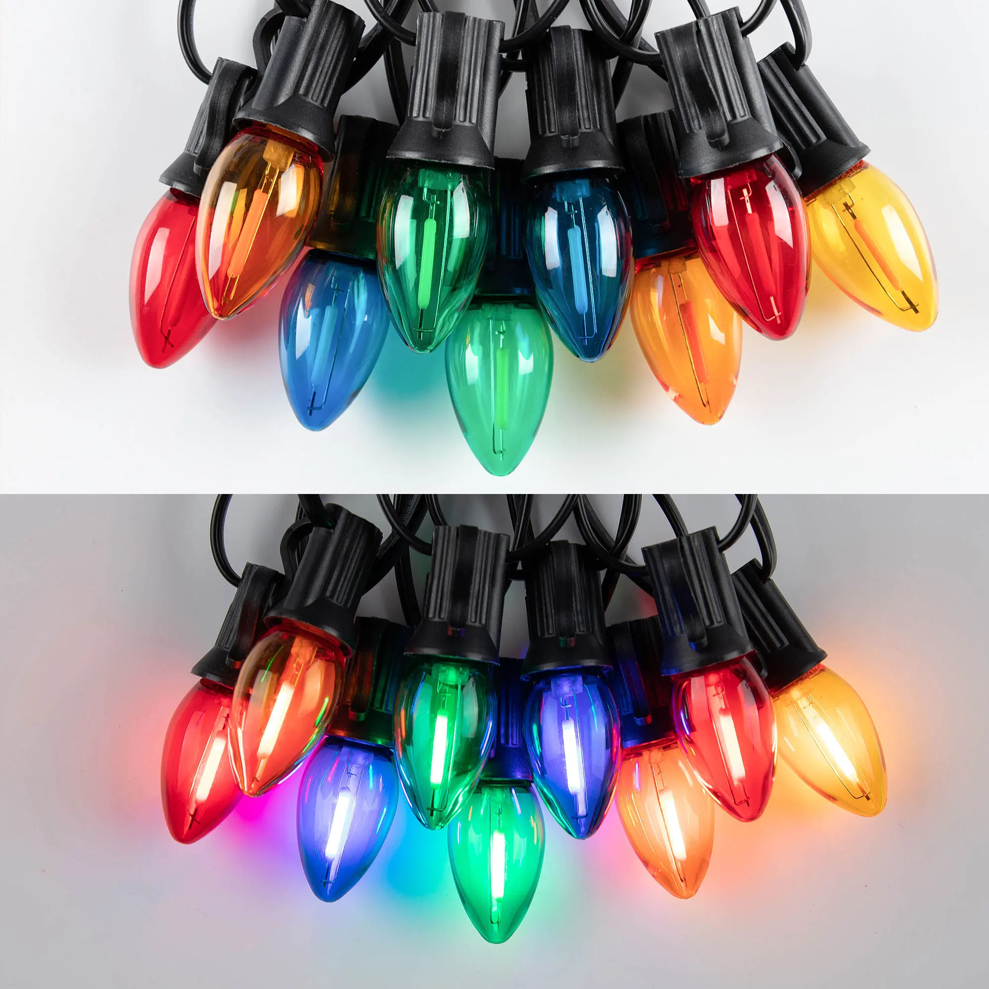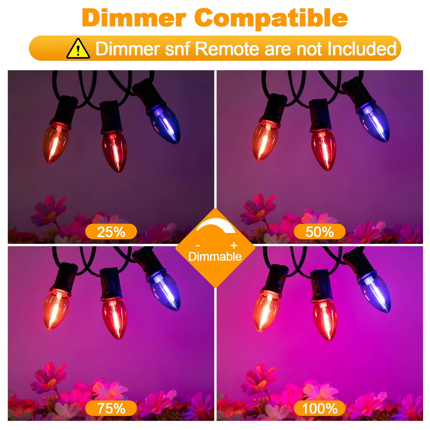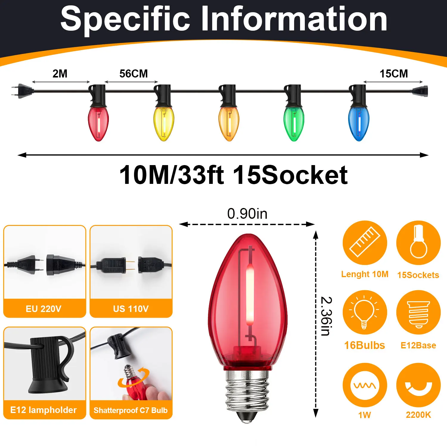 Ahorro de energía: 1 W por bombilla LED C7, más ahorro de energía camparada con bombillas incandescentes de vidrio tradicionales, cadena de luces navideñas LED con eficiencia energética de hasta el 80%, brillo regulable y vida útil de hasta 25000 horas;Las bombillas con colores vibrantes nunca se desvanecerán, astillarán ni se agrietarán.