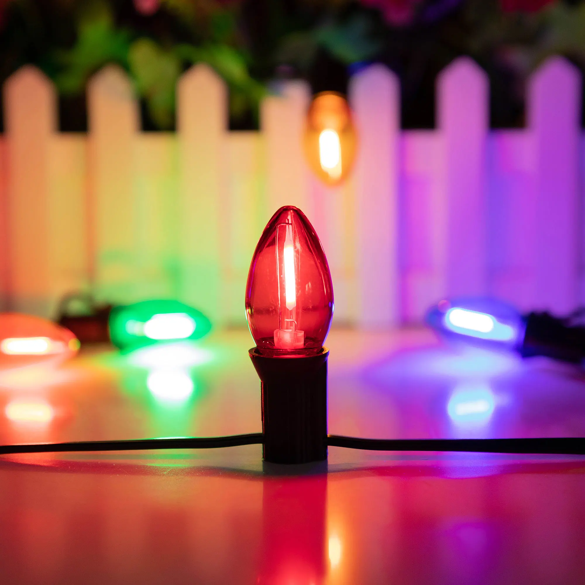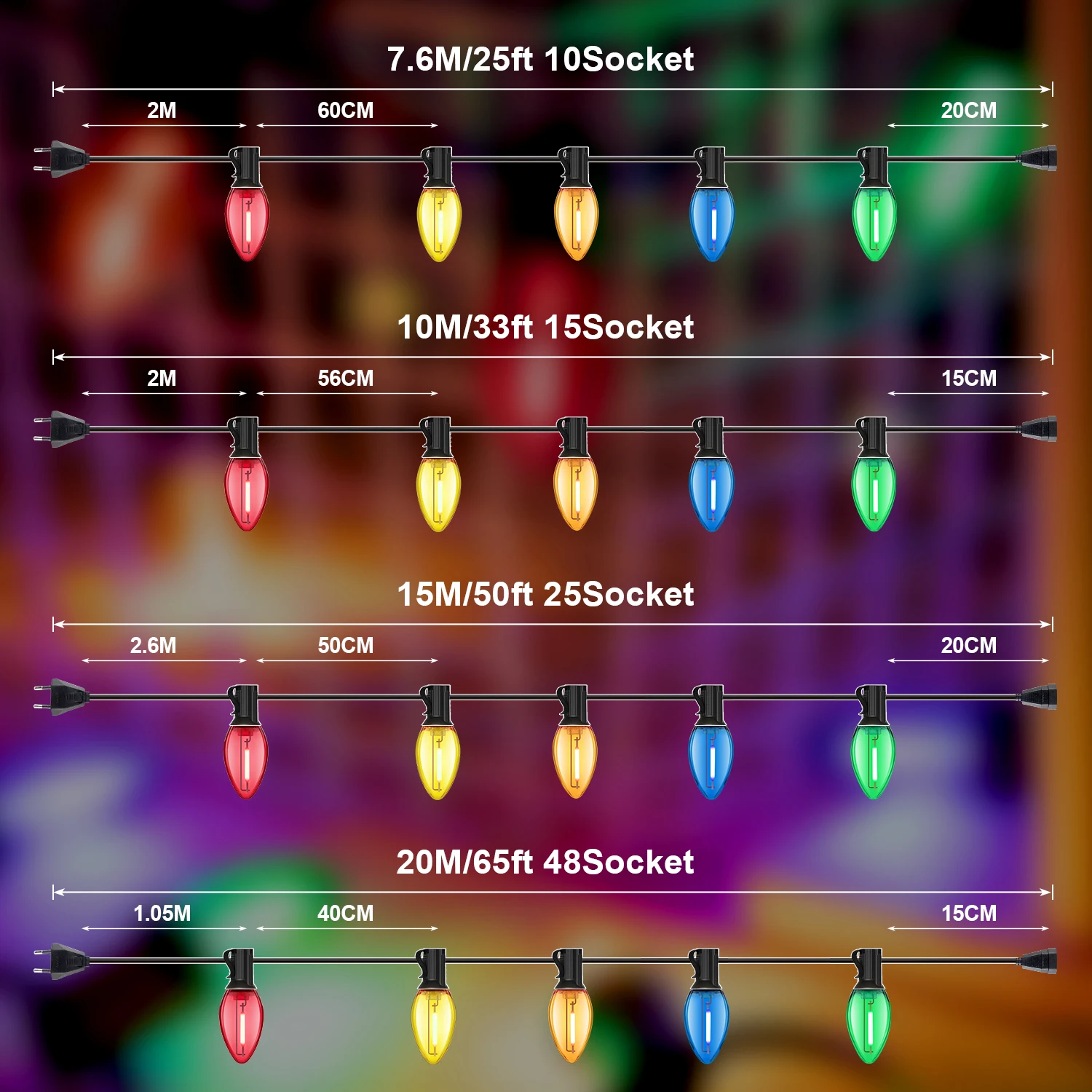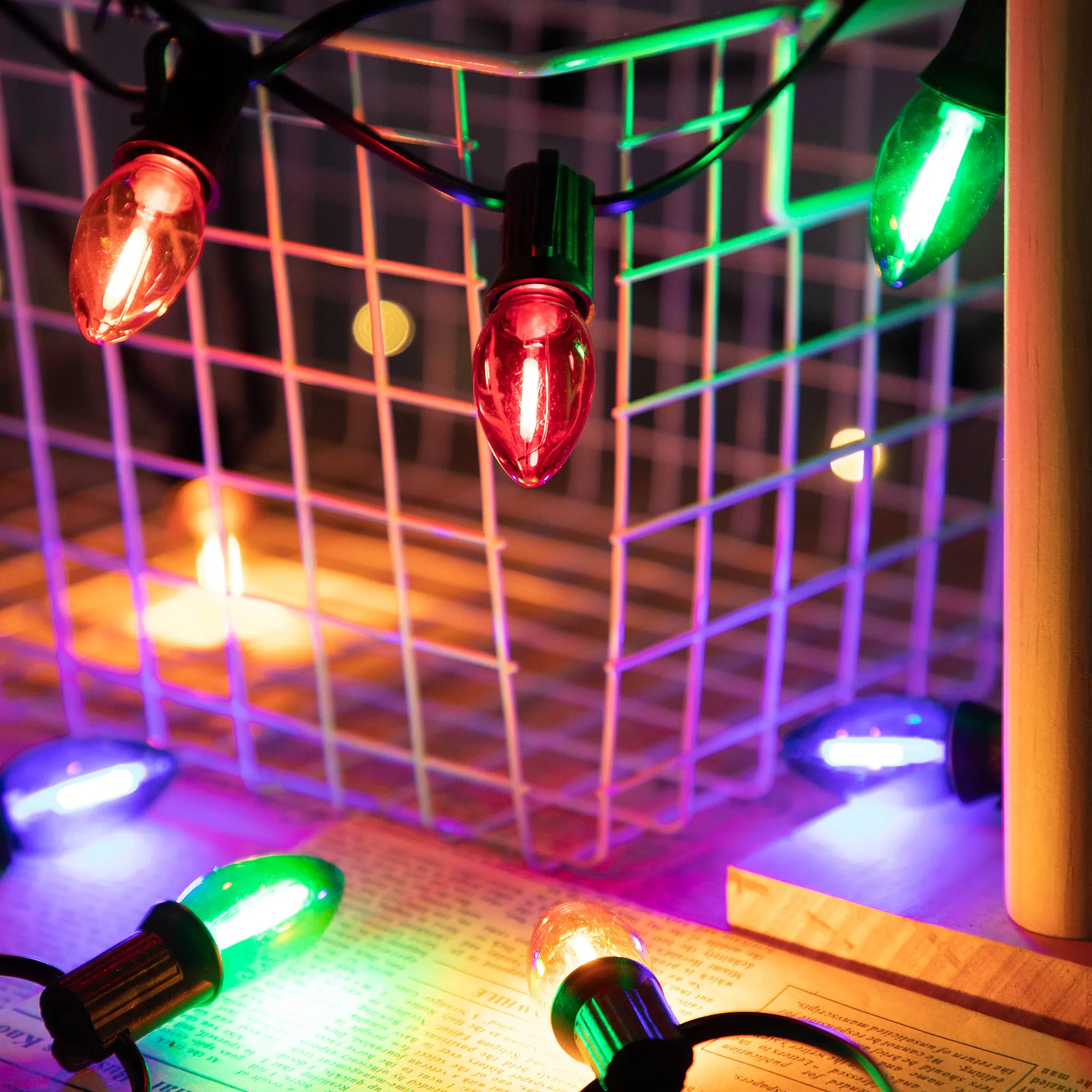 Ahorro de energía: 1 W por bombilla LED C7, más ahorro de energía camparada con bombillas incandescentes de vidrio tradicionales, cadena de luces navideñas LED con eficiencia energética de hasta el 80%, brillo regulable y vida útil de hasta 25000 horas;Las bombillas con colores vibrantes nunca se desvanecerán, astillarán ni se agrietarán.