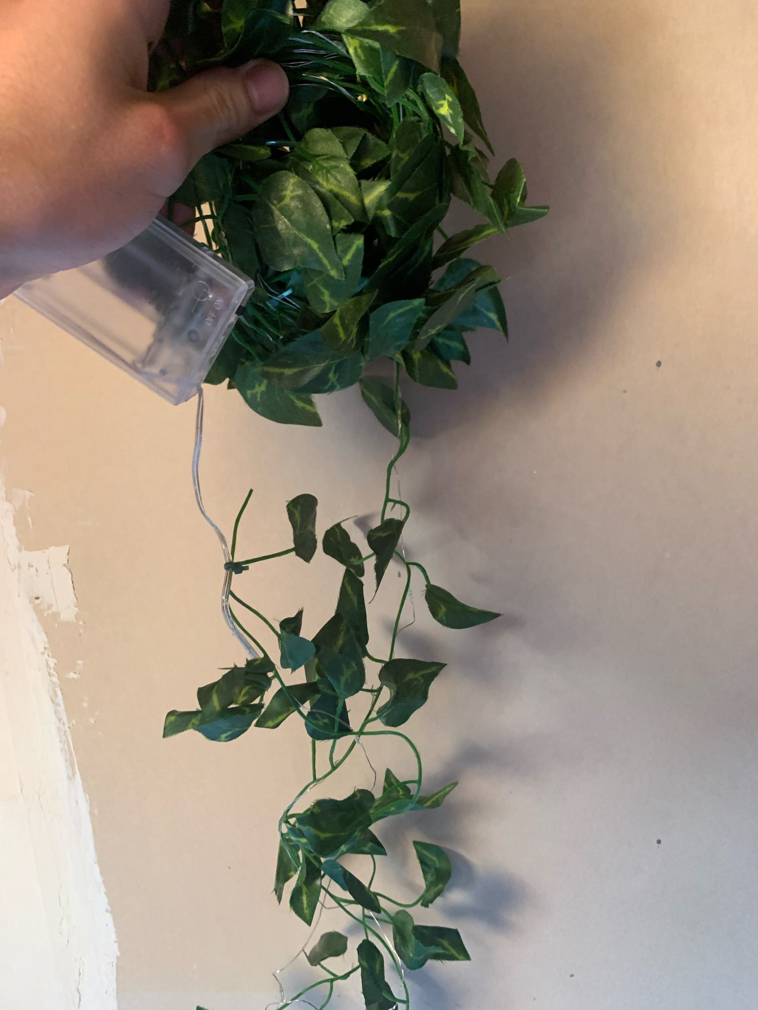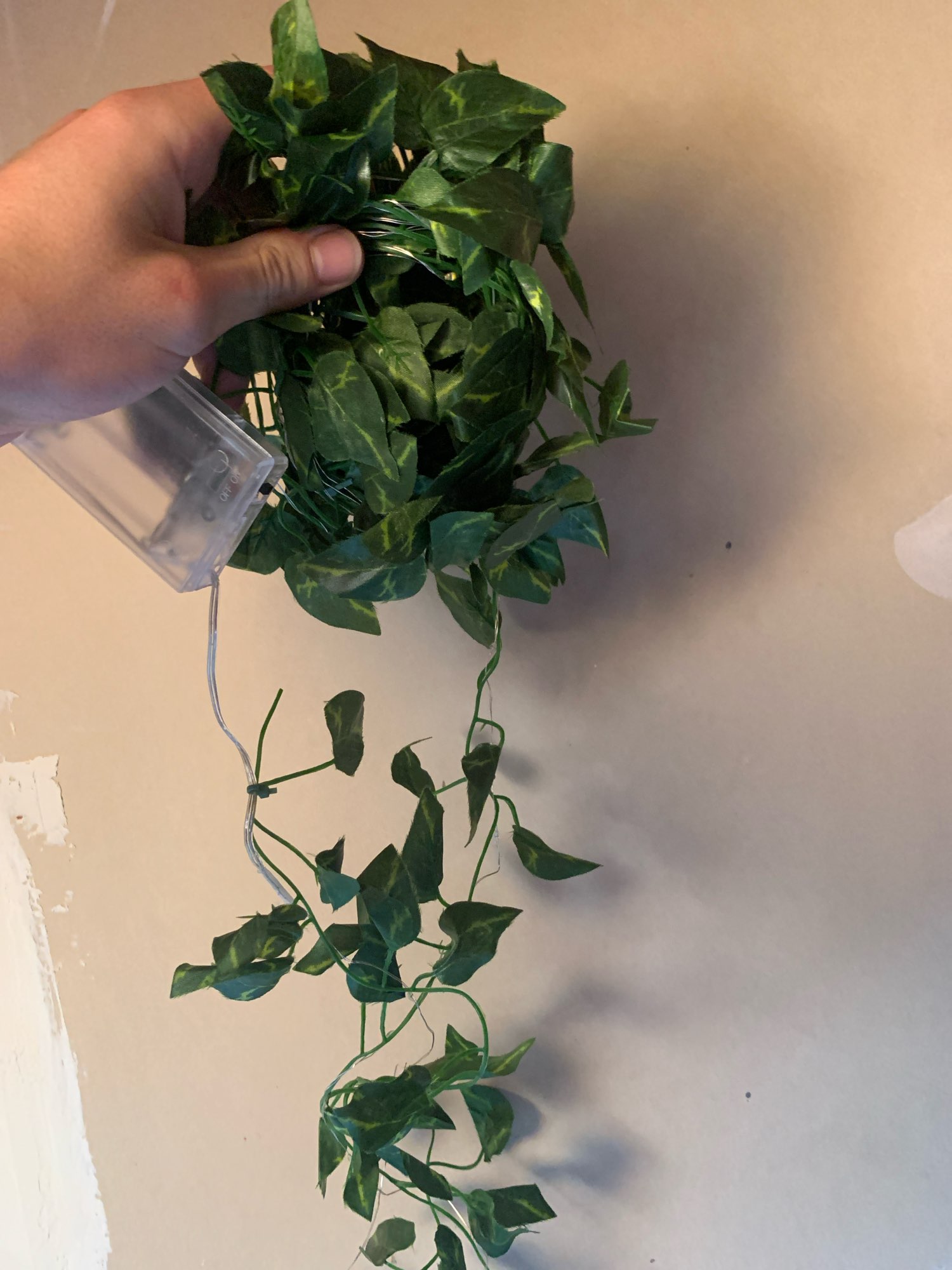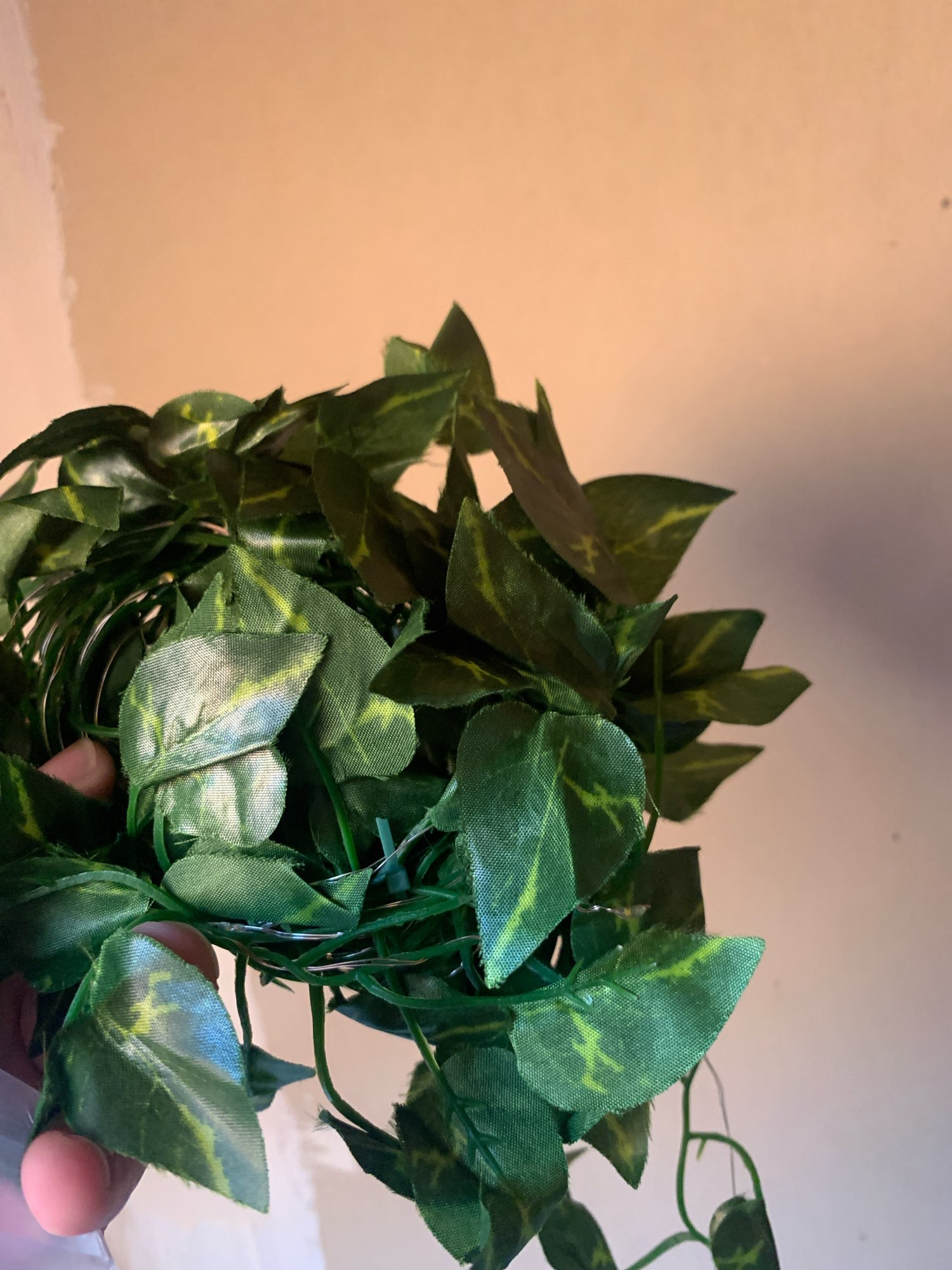Enviaron un poco de plástico, la guirnalda de hojas y la guirnalda de luces no están unidas entre sí. Muy fácil de montar o no. Usé ambas piezas de manera diferente.