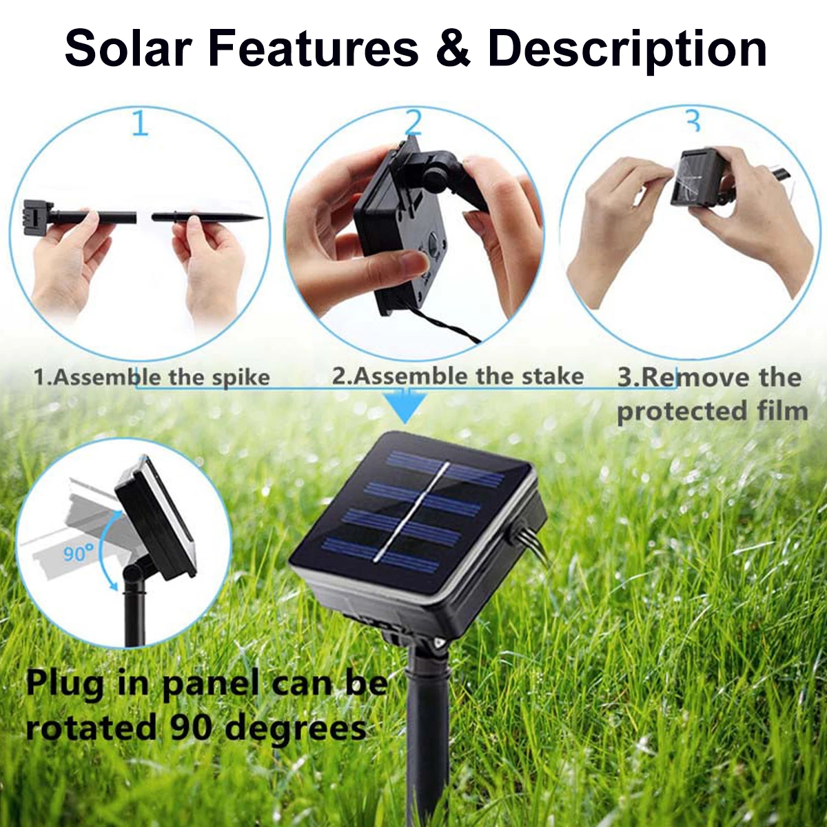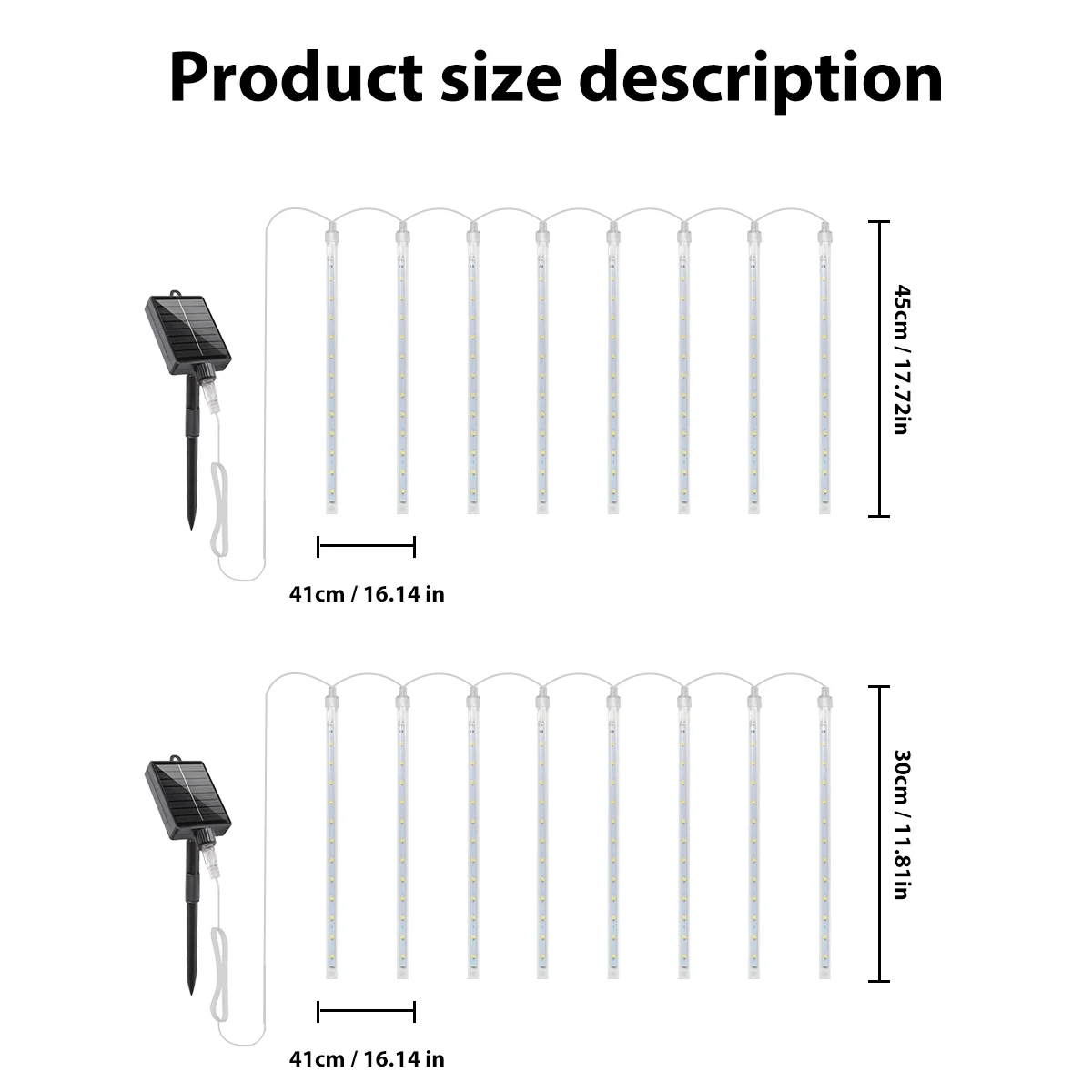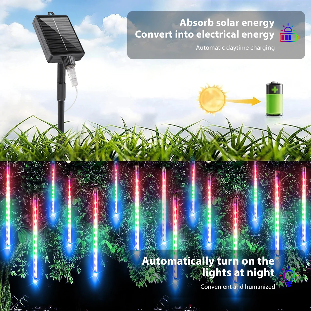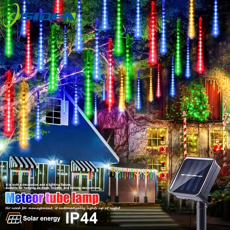 NUEVAS luces meteorológicas alimentadas por energía solar y eficiencia energética: las luces de lluvia que caen funcionan con energía solar.Panel solar totalmente ajustable para adaptarse a la mejor dirección del sol para una mejor carga durante el día.Un sensor fotográfico incorporado se encenderá automáticamente por la noche para una iluminación sin problemas, bajo consumo de energía y ahorro de energía.