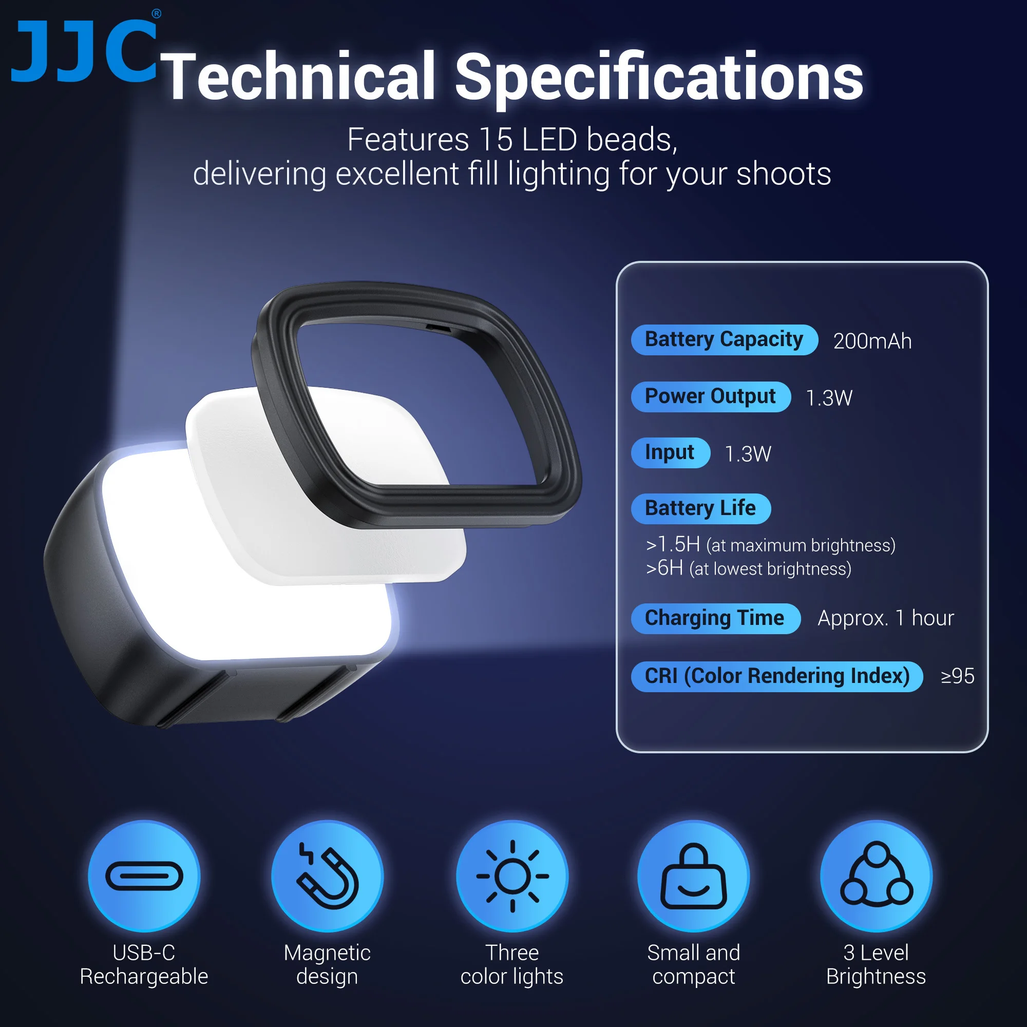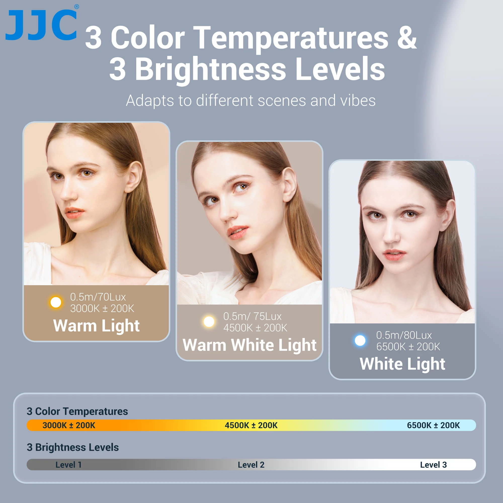 3:3 modos de color × 3 Brillo ajustable: la luz de relleno LED ofrece tres modos de temperatura de color: luz cálida (3000K ± 200K), luz blanca cálida (4500K ± 200K) y luz blanca (6500K ± 200K), con niveles de brillo correspondientes de 70Lux. 75Lux y 80Lux en 0.5 metros (20 pulgadas).(Botón de encendido para encender/apagar y cambiar los modos de color, botón M para pasar por tres niveles de brillo.